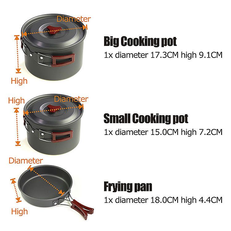 기구 조리기구는 알루미늄 합금으로 만듭니다. 3가지 크기의 캠핑 냄비와 3개의 플라스틱 그릇, 일체형 수저, 일체형 대나무 수저, 일체형 청소용 스펀지가 포함되어 있습니다. 3가지 사이즈의 캠핑용 프라이팬은 DIA.18cm, 높이 4.4cm, 큰 냄비는 DIA.17.3cm, 높이 9.1cm, 작은 냄비는 1개 입니다. 냄비 크기 DIA.15cm, 높이 7.2cm, 모든 부품을 천 가방에 넣습니다. 그것은 당신의 야외 여행이 될 것입니다. 당시에는 좋은 선택이었습니다.