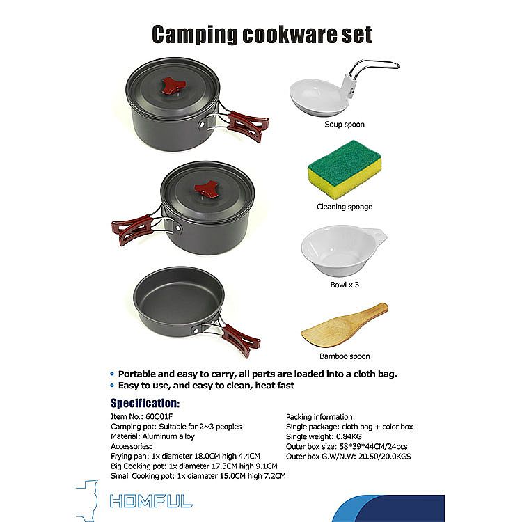 60Q01F 프라이팬: 1x 직경 18.0CM 높이 4.4CM 큰 냄비: 1x 직경 17.3CM 높이 9.1CM 작은 냄비: 1x 직경 15.0CM 높이 7.2CM 덮개: 2x 그릇: 3x 숟가락: 1x 밥숟가락: 1x 세척: 1x 60Q01F