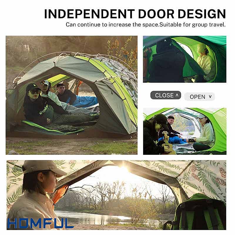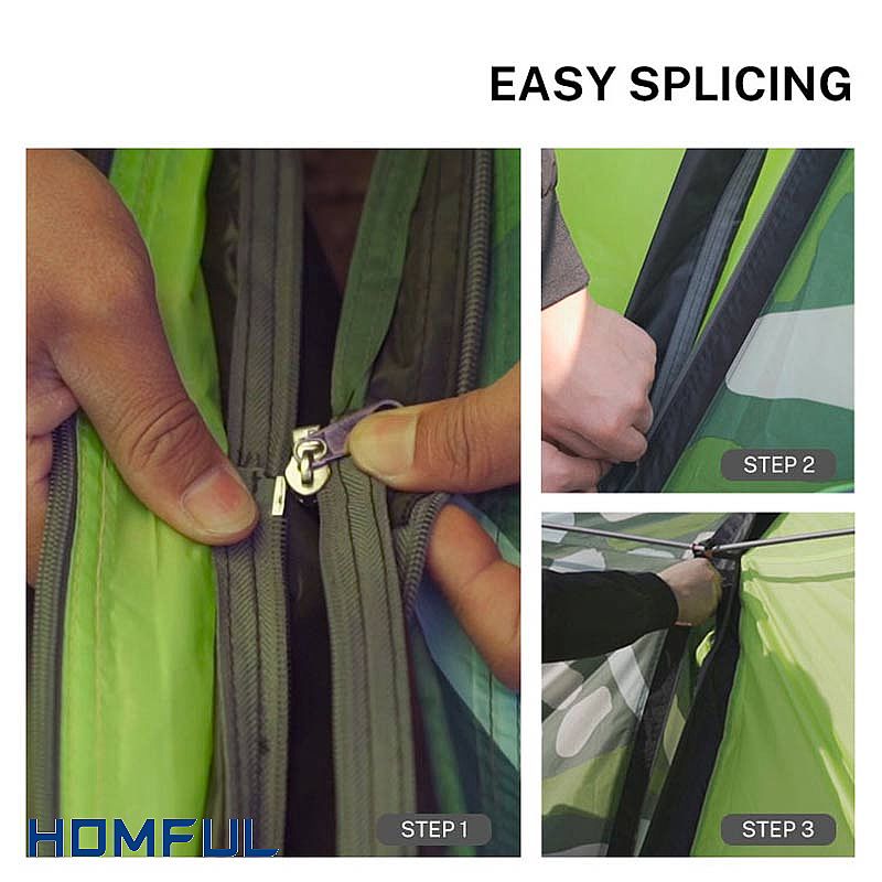 그래서 Homful Group은 아이디어를 냈습니다. 어떤 종류의 텐트가 이 상황을 해결할 수 있습니까? 우리의 디자인과 연구를 통해 새로운 캠핑 텐트가 탄생했습니다. 이 텐트는 단독으로 사용할 수 있습니다. 혼자 사용시 2~3인용 텐트입니다. 그러나 텐트를 연결하여 텐트를 다인용 텐트로 만들 수도 있습니다. 우리는 텐트의 문을 업그레이드했습니다. 텐트 상단에 지퍼를 달아 지퍼로 텐트를 연결할 수 있도록 했습니다. 지퍼 이음새를 통해 물이 스며드는 것을 방지하기 위해 지퍼의 재봉 부분을 방수 처리합니다. 그리고 텐트의 완벽한 방수를 위해 방수 지퍼도 사용했습니다.