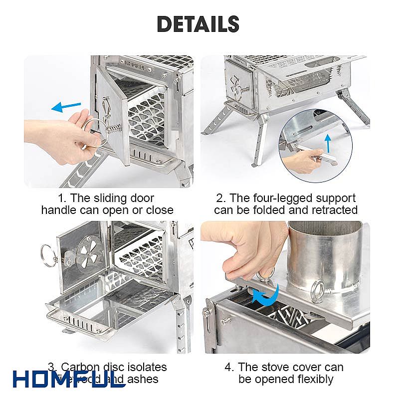 이 스테인리스 스틸 텐트 스토브는 304 스테인리스 스틸과 430 스테인리스 스틸로 만들어져 사용 후 청소할 때 닦는 것만으로도 더 쉽게 됩니다. 고온 저항은 매우 좋고 변형하기 쉽지 않습니다. 스토브의 모든 부분과 그 부속품은 사용하기 쉬우면서도 충분히 강하도록 설계되었으며 파이프 근처에는 상단 플랫폼을 열 수 있는 오프너가 있어야 하고 상단 플랫폼 주변에는 많은 구멍이 있고 댐퍼는 적응 가능하며 구멍이 있는 바람막이는 두 개의 재떨이로 연소가 더 잘 되도록 합니다.