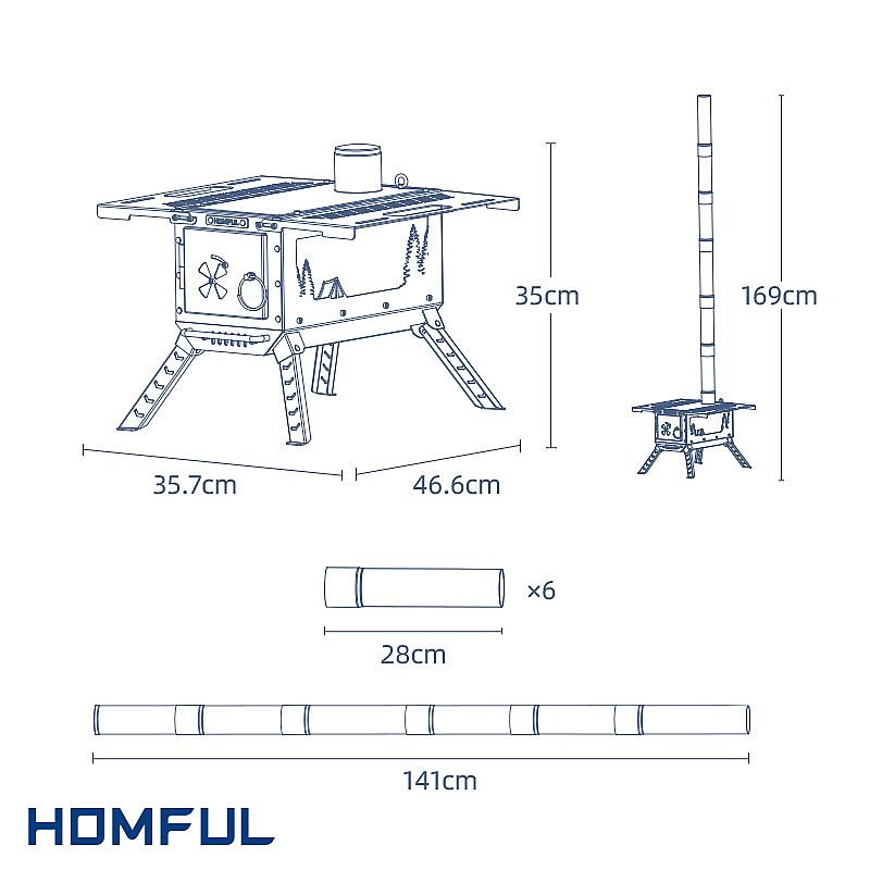 이 스토브는 2차 연소로 설계되어 스토브에 나무를 채우고 밤에 불을 붙일 수 있으며 연료는 밤새 고르게 연소됩니다. 텐트 스토브는 캠핑 텐트 난방, 낚시, 요리, 핫팟, 파티, 팀 빌딩 등과 같이 캠핑 텐트 내부 또는 외부에서 야외에서 화덕 바베큐 그릴 또는 요리 항목으로 사용하도록 설계되었습니다.