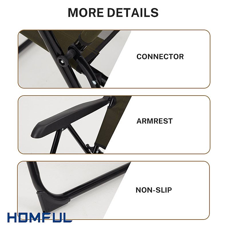 이 휴대용 접이식 의자의 등받이는 5단계로 조절할 수 있으며 사용자는 자신의 편안함에 따라 조절할 수 있습니다. 또한 이 의자의 높이도 조절할 수 있어 다양한 환경에 적합합니다. 의자에는 컵 홀더 디자인이있어 잡지, 물컵 및 기타 품목을 놓을 수 있습니다. 의자 다리의 발 패드 디자인은 의자가 더 안정적이고 넘어질 가능성이 적습니다. 의자 내부는 스펀지로 채워져 있고 표면은 통기성이 좋은 메쉬로 디자인되어 부드럽고 편안하게 앉을 수 있습니다. 색상,...