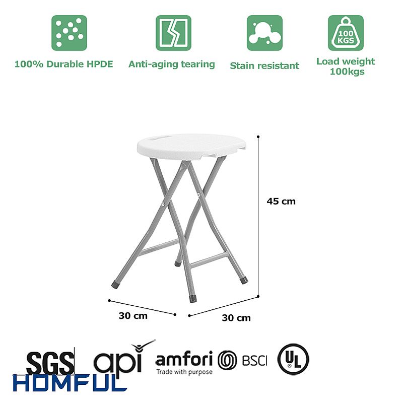 내구성: 고품질 HDPE 소재로 제작된 이 스툴은 내구성이 뛰어납니다. 견고한 프레임은 안정성을 보장하고 상당한 무게를 지탱할 수 있습니다. 시트는 내구성이 뛰어나고 세척이 쉬운 패브릭으로 제작되어 정기적인 사용에도 오랫동안 사용할 수 있습니다.