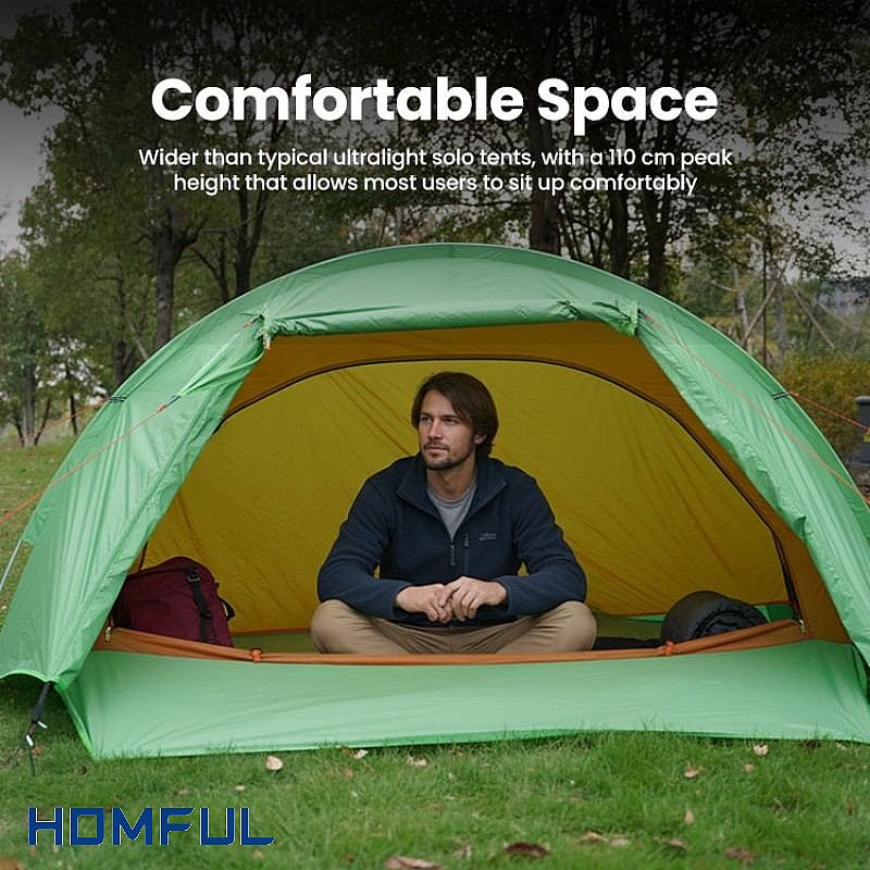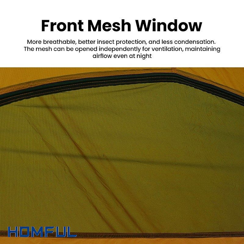 이 텐트의 가장 큰 장점은 편안함입니다. 대부분의 초경량 텐트는 답답한 느낌을 주지만, 이 텐트는 그렇지 않습니다. 110cm의 높은 천장과 넉넉한 공간 덕분에 앉아서 장비를 정리하거나 편안하게 숨을 쉴 수 있습니다. 전면 메쉬 창은 통풍과 방충 효과를 높이고 결로 현상을 줄여주는 스마트한 디자인 요소입니다. 또한, 문을 닫아도 통풍이 유지되도록 독립적으로 열 수 있습니다.