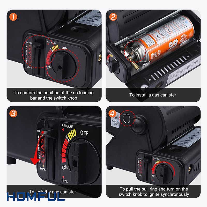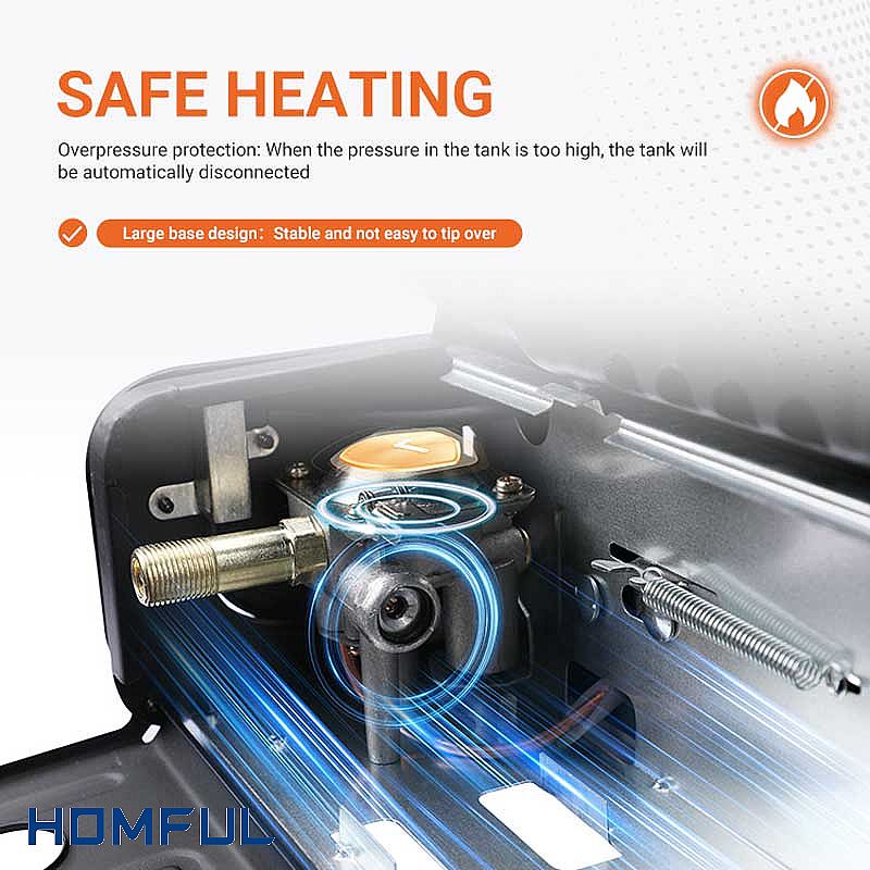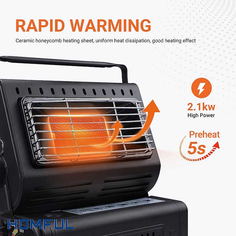 홈풀 그룹 2 in-1 휴대용 부탄가스 프로판 캠핑히터는 별도 구매 가능한 표준 부탄 캐니스터와 함께 사용하도록 설계되었습니다. 캐니스터를 배치한 후 안전 잠금 장치를 눌러 캐니스터를 잠글 수 있습니다. 당김 고리를 당기고 스위치 손잡이를 켜서 동시 점화 설정 및 사용이 쉽고 어떤 기상 조건과 장소에서도 사용할 수 있도록 설계되었습니다. 990도 각도 조절이 가능한 다용도 스토브는 물을 끓일 때 필요에 따라 히터 방향을 조정할 수 있다는 장점이 하나 더 있어 캠핑 부탄 히터는 모든 야외 활동에 적합합니다. 캠핑, 낚시, 사냥 및 기타 야외 활동에 이상적입니다. 접이식 손잡이를 접고 접을 수 있어 히터의 크기를 줄일 수 있어 보관이나 운반에 더욱 컴팩트합니다. 정전 등 비상시에도 유용하게 사용할 수 있습니다. 히터는 작업장이나 차고와 같은 실내에서도 사용하기에 좋습니다. 또한 캠핑카, RV 또는 텐트에서 사용하기에 적합합니다.