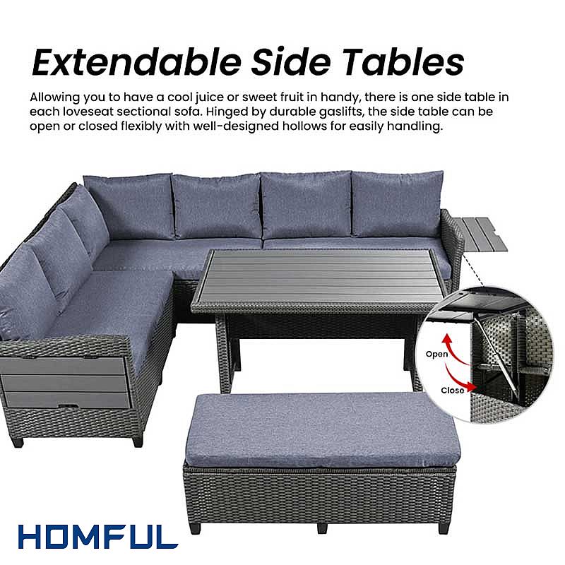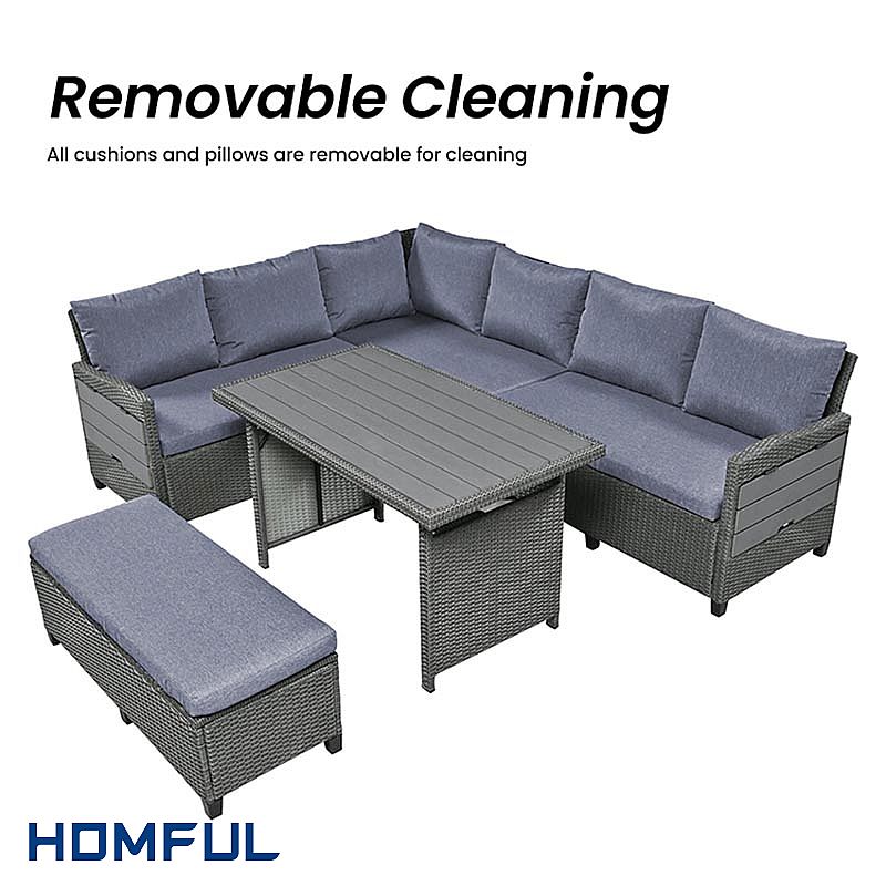이 5피스 라탄 소파 세트는 사이드 테이블이 있는 더블 소파 2개, 코너 소파 1개, 긴 벤치 1개, 다이닝 테이블 1개로 구성되어 있어 7명이 편안하게 앉을 수 있습니다. 널찍한 테이블은 음식과 음료를 놓기에 완벽합니다. 테이블 아래의 조절식 발은 테이블이 가능한 한 평평하고 안정적으로 유지되도록 합니다. 뒷마당을 여가 공간으로 쉽게 바꾸고 햇살 가득한 순간을 즐기세요!
