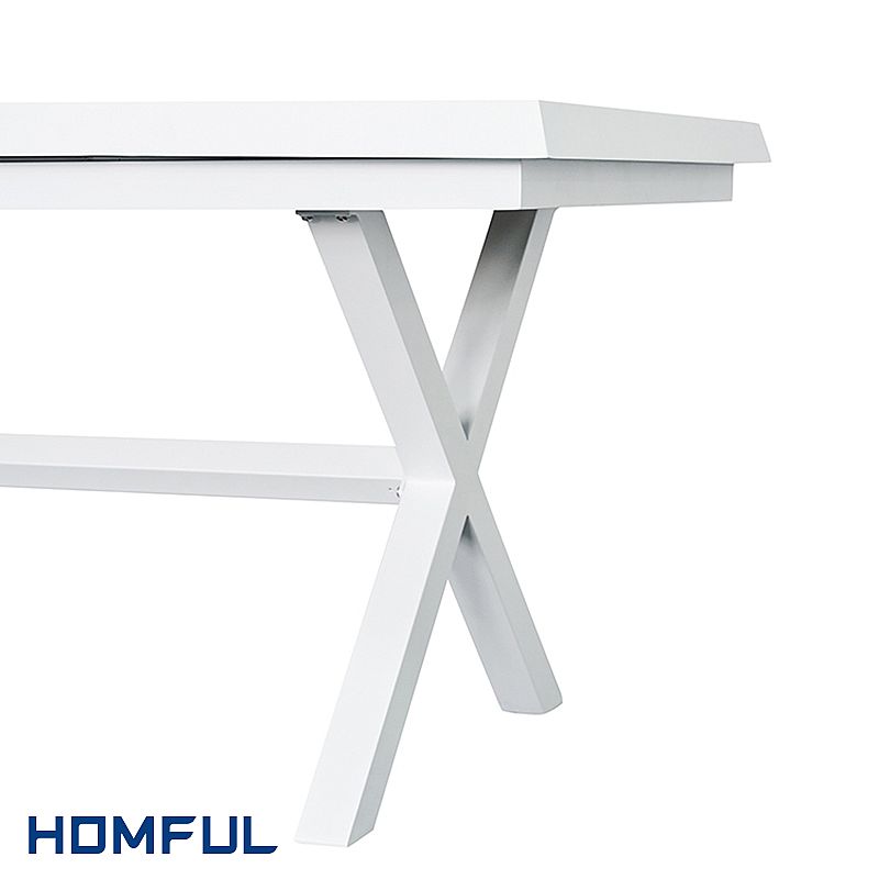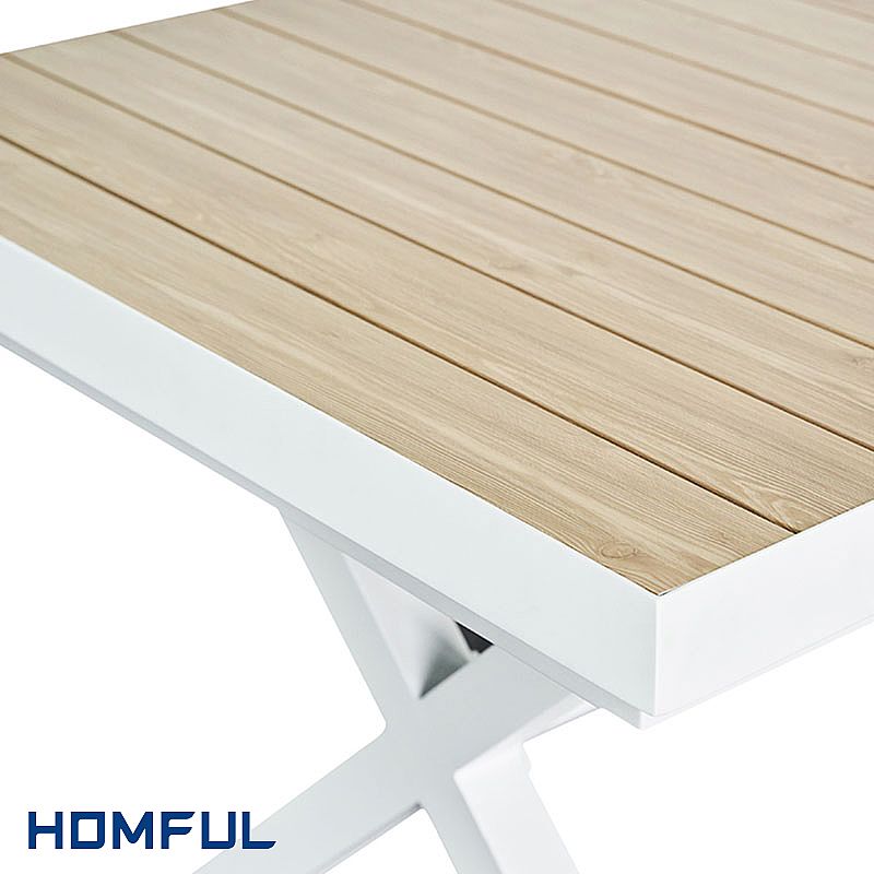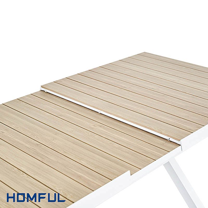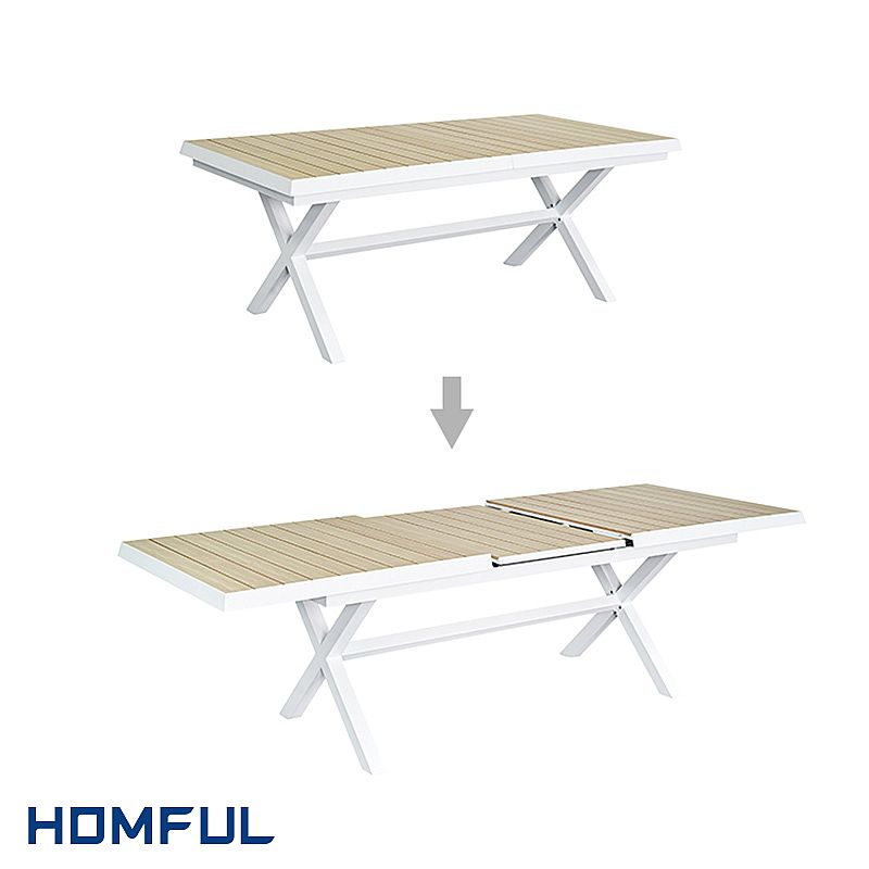 HOMFUL 11D26D 화이트 알루미늄 확장형 파티오 식탁을 만나보세요. 테라스, 빌라 정원, 수영장 데크를 조용히 업그레이드해 주는 야외용 테이블입니다. 기본 설정 시 깔끔하고 모던한 슬랫 상판이 햇빛 아래에서도 세련되게 빛나며 6명이 편안하게 앉을 수 있습니다. 손님이 오셨을 때는? 부드러운 슬라이딩 확장 시스템을 이용해 160cm에서 220cm로 늘릴 수 있어 흔들림이나 번거로움 없이 6~8인용 테이블로 변신합니다. 풀 알루미늄 프레임에...