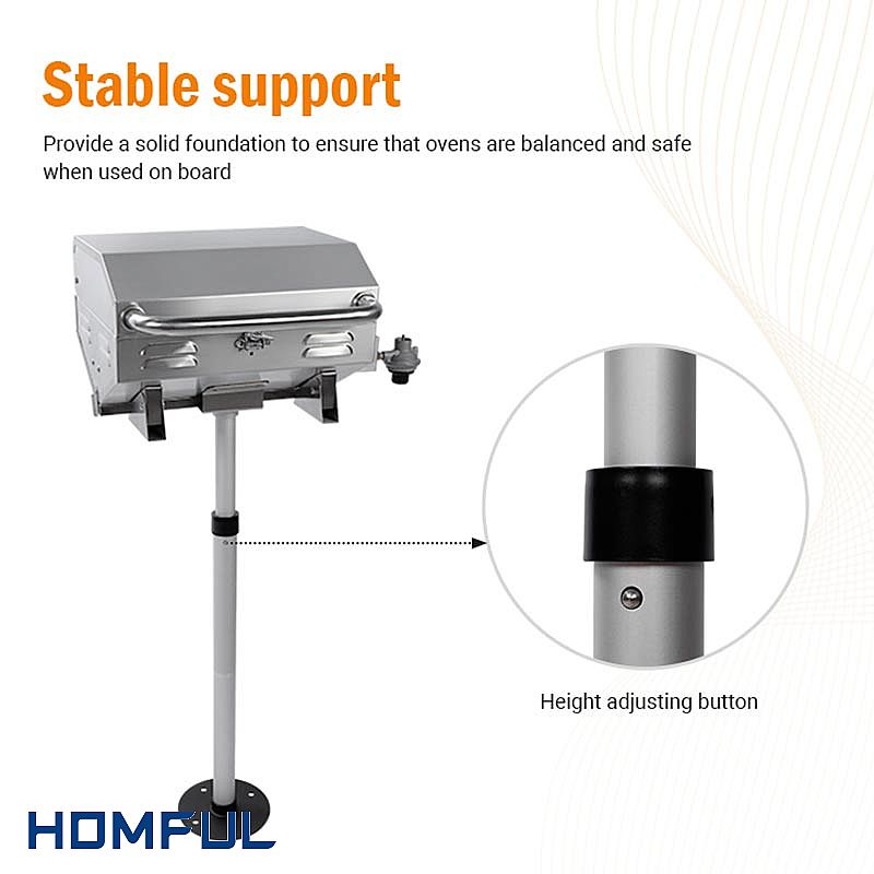 Der Multifunktions-BBQ-Grill von Marine besteht aus robustem Edelstahl und ist leicht zu reinigen. Der aufrechte BBQ-Grill verfügt über einen leicht zu tragenden und schnell abnehmbaren Sockel. Der Stent besteht aus Aluminium. Die Wandstärke des Aluminiumrohrs beträgt 2,5 mm. Es kann bis zu 200 Pfund tragen. Wie Sie sehen, müssen wir uns keine Sorgen machen, dass das Essen herunterfällt, wenn der BBQ-Grill nicht stabil genug ist. Die Höhe der Basisrohre lässt sich auf 28cm verstellen und mit einer Schnalle fixieren. Die Höhe von 28 cm ist verstellbar. Sie können ihn auf die Höhe einstellen, die für Sie am besten geeignet ist. Auf diese Weise müssen Sie sich nicht bücken. Langes Bücken ist ermüdend und schadet unserem Rücken.