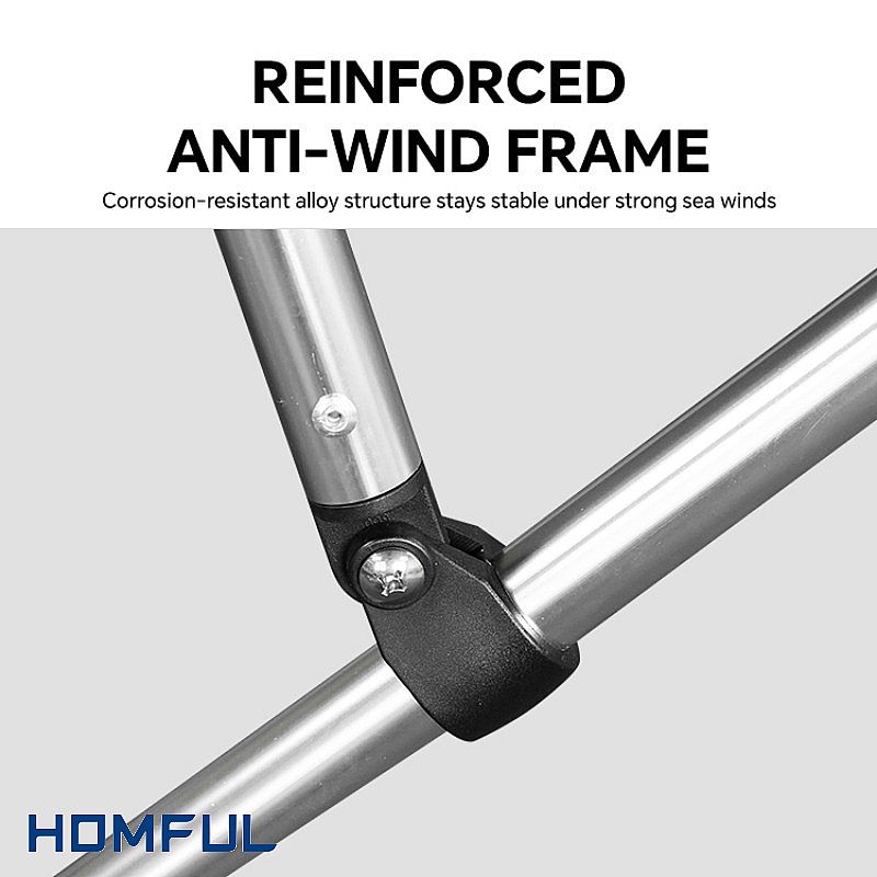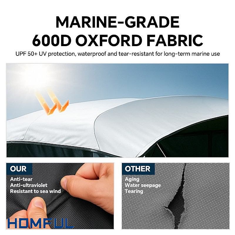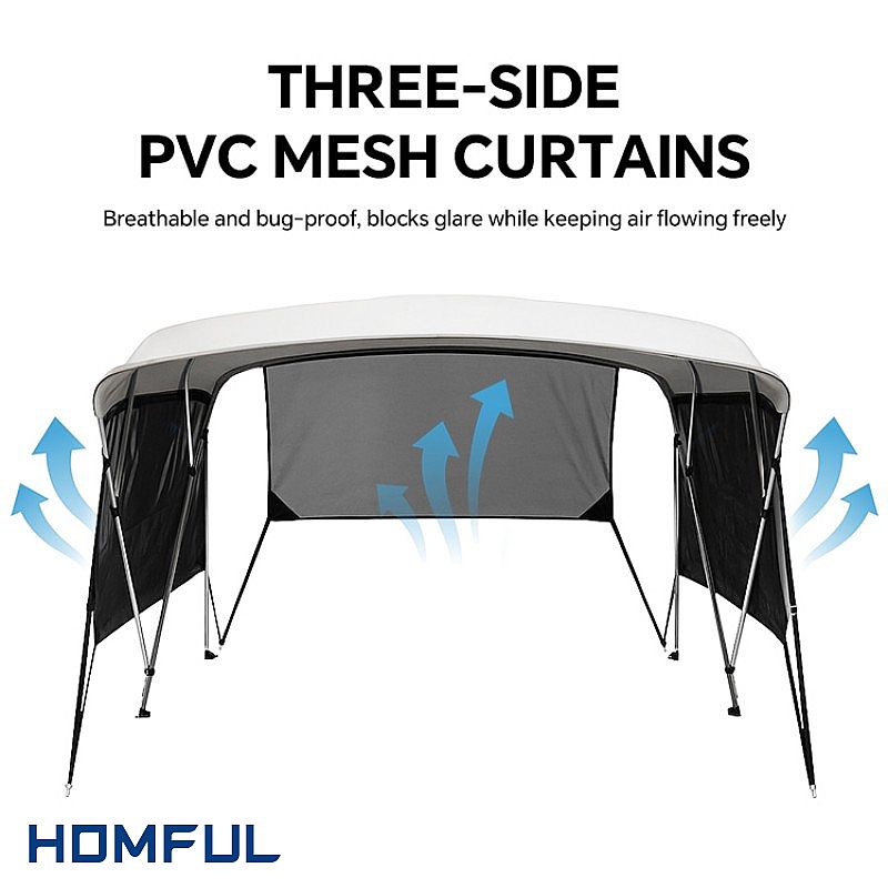 Dieses Verdeck ist nicht nur beliebt, sondern unverzichtbar. Das abnehmbare 3-seitige Mesh-Bimini-Top von HOMFUL kombiniert ein robustes, seewasserbeständiges Gewebe mit flexiblem Wind- und Insektenschutz und ist damit die ideale Beschattungslösung für Fischerboote, Tageskreuzer und Bootsverleiher. Das Verdeck besteht aus seewasserbeständigem 600D Oxford-Gewebe mit UPF 50+ UV-Schutz und hoher Reißfestigkeit für den langfristigen Einsatz im Freien. Drei seitliche PVC-Mesh-Vorhänge reduzieren Blendung, halten Insekten fern und sorgen gleichzeitig für optimale Luftzirkulation – so bleibt das Cockpit angenehm kühl, ohne dass man sich eingeengt fühlt.