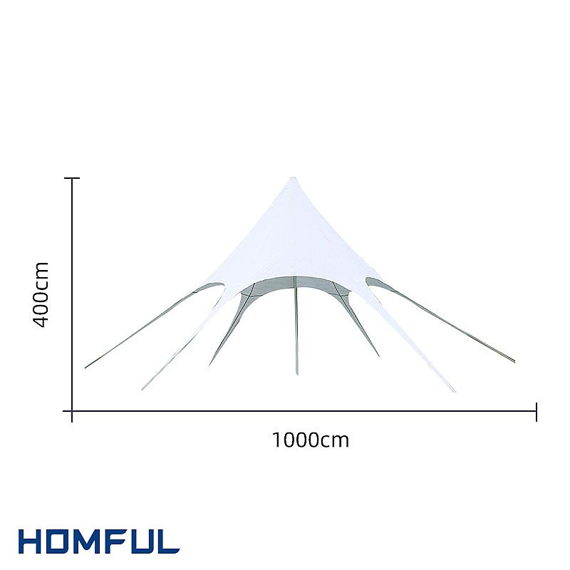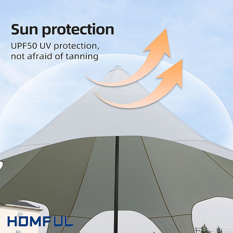 Esta lona para acampar adopta un diseño de aguja hexagonal, que es diferente de la forma de dosel normal. Este dosel para acampar es único y llamativo cuando se trata de actividades al aire libre. Más de 78 metros cuadrados de área de sombra pueden acomodar a 20 personas simultáneamente.