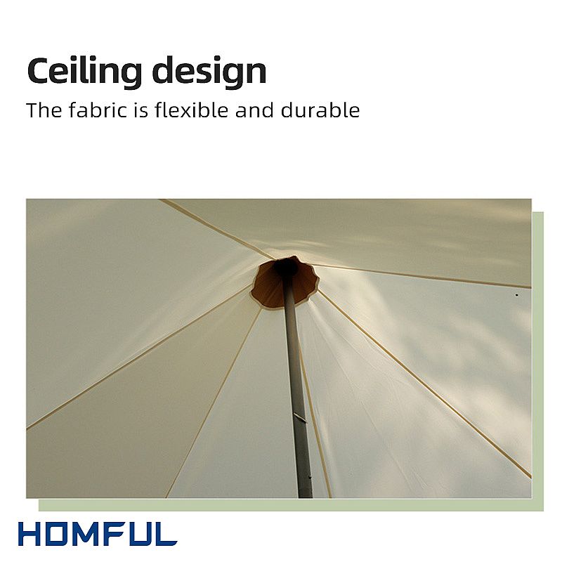 Esta lona para acampar utiliza un diseño único de alero de carpa de cuatro lados. Haga que la lona al aire libre se vea hermosa y haga que la lona para acampar se drene mejor. El diseño curvo hace que la parte superior de la marquesina tenga suficiente espacio para la sombra, pero está ventilada por todos los lados. Puede hacer que los usuarios se sientan cómodos en un entorno natural y tengan una hermosa experiencia al aire libre.