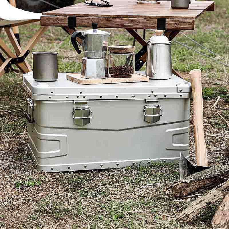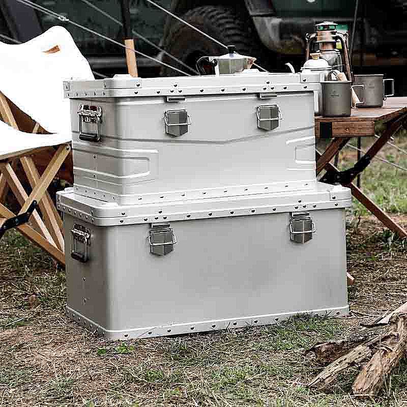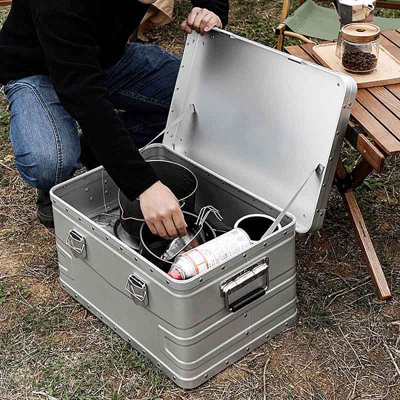 The whole body uses 5052 aluminum alloy. The camping storage box is firm and durable. Moreover, the four corners of the box have protective covers, which can increase the impact resistance of the box and make the box more firm. The whole use of rivets and the welding process to connect the box greatly improves the integrity and stability of the box. The box can also be used as a table when not in use, which is a very practical multi-functional box. The capacity of the storage box is 30KG, so you can put a lot of things in it.