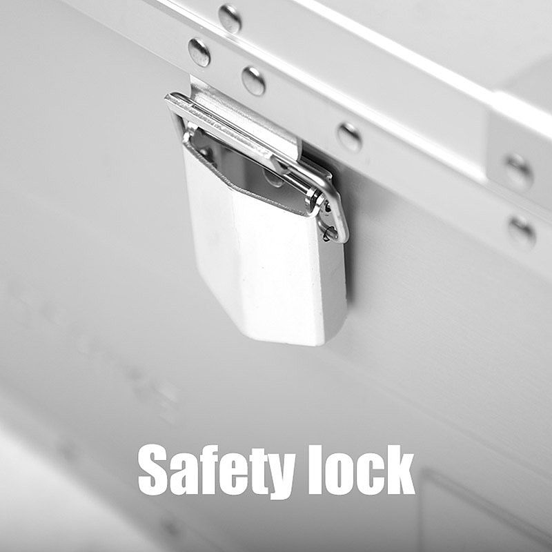 The multi-functional camping storage box is made of aluminum alloy, and the surface is oxidized, a very beautiful aluminum color. Silver makes the overall case look more comfortable and high-end. We can also customize the color of the box, but at this time, our surface treatment is to use the process of plastic spraying. As the case is made of aluminum alloy, the material of the case is recyclable and recyclable. The aluminum alloy also makes the case very durable, with a service life of at least two years. More importantly, aluminum alloy material is corrosion-resistant and not easy to rust. Aluminum alloy material is non-magnetic and will not damage electronic products.
