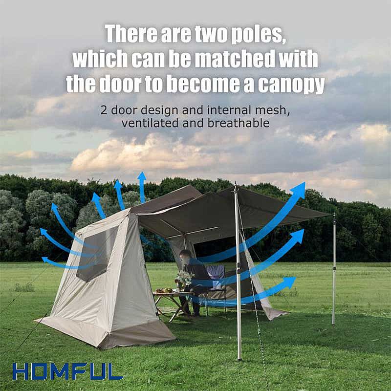 Canvas tents are not as simple as traditional tents when you and your family are out. It is made of polyester-cotton canvas, with superior air permeability and good water resistance. With full marks for practicality, the exterior design is also innovative, giving you a comfortable, home-like feel. The interior of the cabin tent is coated with black glue, which can play a role in shielding ultraviolet light. It also better blocks out sunlight, making you more comfortable when you sleep in the canvas tent.