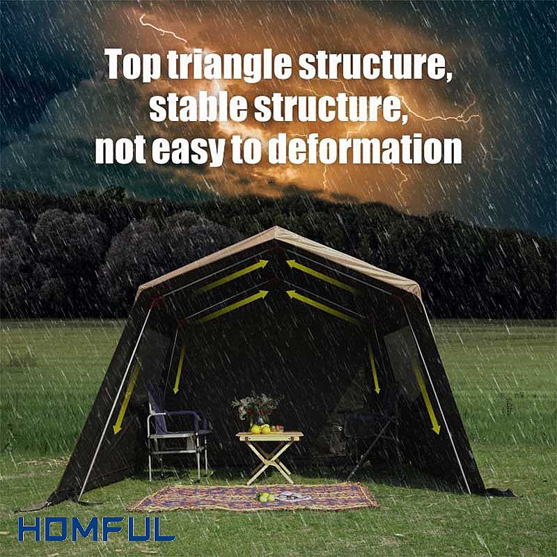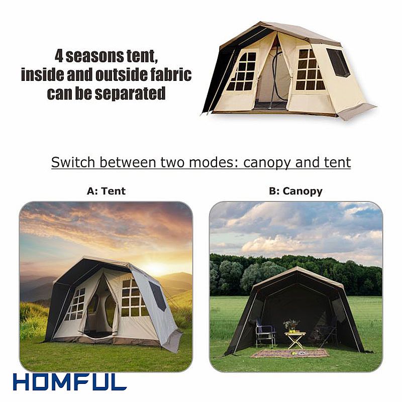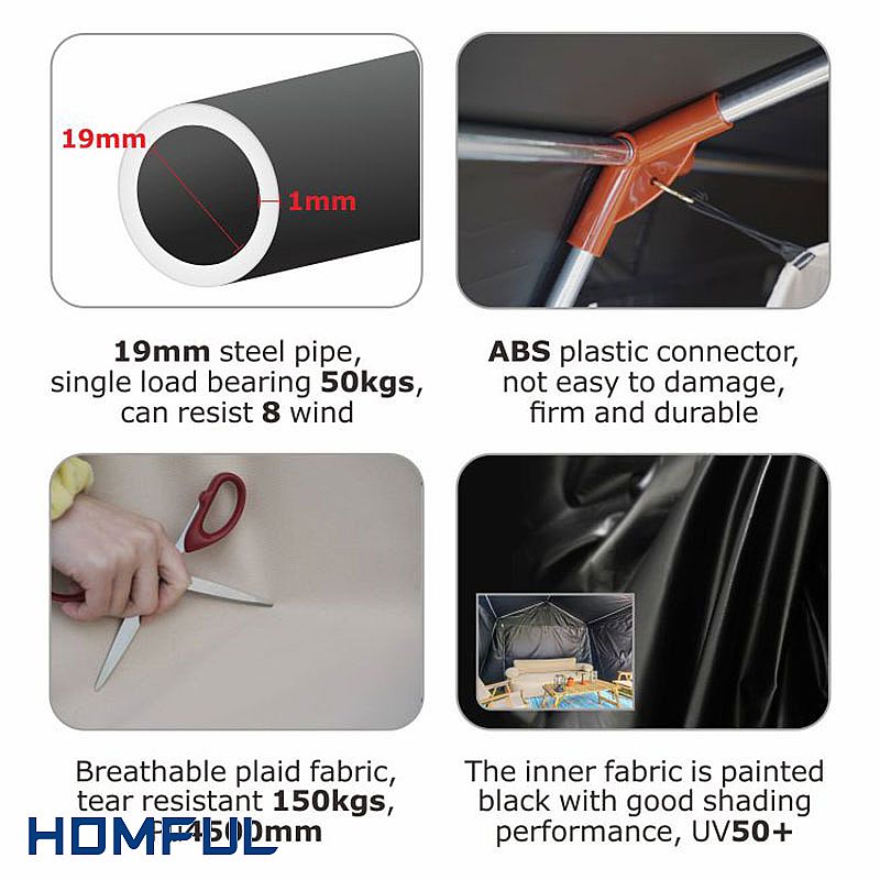 The canvas tent fabric is made of anti-tear plaid cloth, waterproof performance reaches 4500mm. Waterproof tape is made at the seams of the outer cabin tent fabric to better prevent rainwater from entering. Moreover, the stitching of the inner cloth is waterproof so that rainwater does not seep in from the outside.