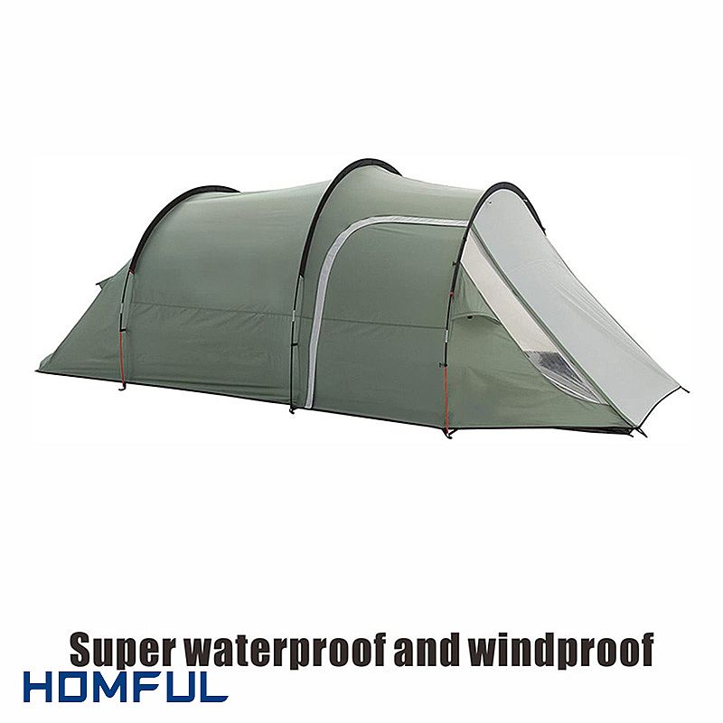This tunnel camping tent is made of polyester. 190T polyester is the most popular material for high-end tents. The material is very cost-effective, and the fabric is cheap and light, waterproof, and breathable relatively well. The surface of each tent is PU coated, and the waterproof level can reach 2000mm. The stitching of each tent shall be treated with waterproof tape so that the stitching shall not leak. Also, the tents will not leak when tested in heavy rain, which is the charm of this tunnel tent. Our fabric can also increase the function of sun protection. This fabric has UPF of 30, which can filter UV rays.