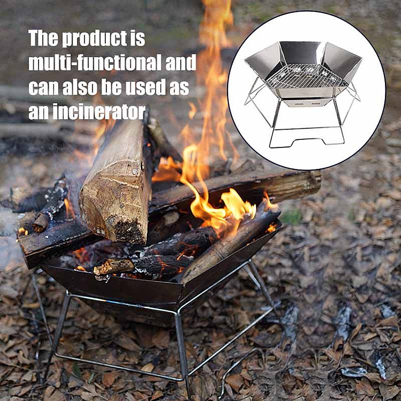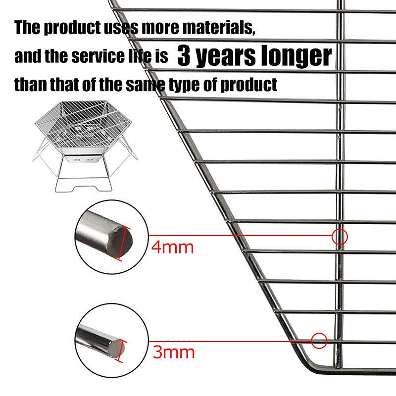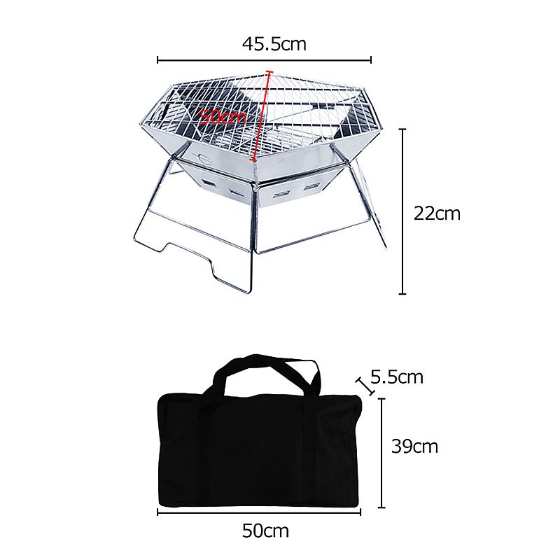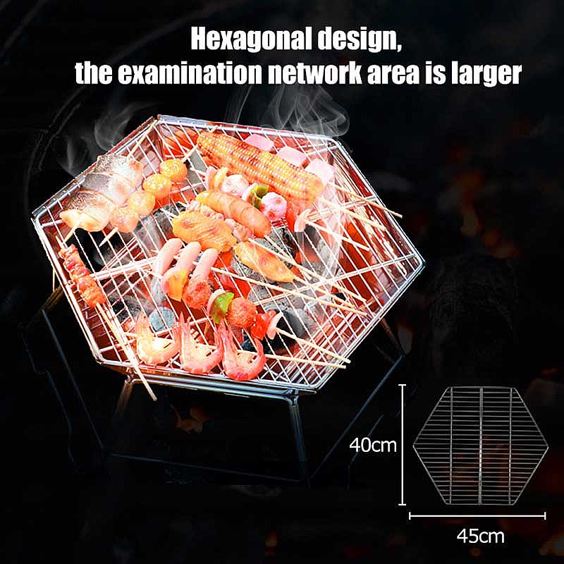 This portable bbq grill also can be called a hexagonal grill cause of its 6 angles With four stable feet will not be easy to moveable, made of the material 201 stainless steel, and 430 stainless steel which can be directly in contact with foods to ensure safety, hygiene, health and easy cleaning, Q195 iron feet original of stainless steel silver color, the open size 49.5*45.5*22cm, folding size 50.7*29*6cm small size is less space for storage, lightweight to holding. the thickness of the body furnace is 0.5MM according to the clients also can be more thickened like 0.5MM to 1MM the grill net is 3MM durable use not easy warped, in the body, the furnace can use a laser logo or embossed logo. After folding will be a small size for packing also, one peace place in the inner white box then fit into one carry bag which is made of 600D oxford, can add wash label with made in china mark, the option or logo in carrying bag silk screen logo or leather logo than, last 5 pcs can fit in 52x41x31cm carton. When to use it very easy, fast with a second to set up easy to open not complicated, after using this bbq grill is fast be cleaned and organized, and takes up small space in your car or your home anywhere by the corner.