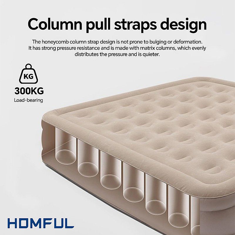 La superficie utiliza tela de felpa flocada de PVC: suave, densa y agradable para la piel desnuda. También es resistente al agua, por lo que los derrames y la humedad exterior no se convierten en un problema de servicio al cliente: límpialo y sigue adelante. El cuerpo del colchón presenta una construcción de doble capa y un diseño de soporte de columna de panal que ayuda a distribuir el peso de manera más uniforme para una experiencia de sueño más estable. Con 200 × 150 × 40 cm, es más alto que muchas camas de aire básicas, lo que facilita la entrada y salida de los adultos, ideal para uso doméstico, alquileres y configuraciones de glamping.