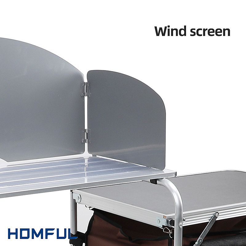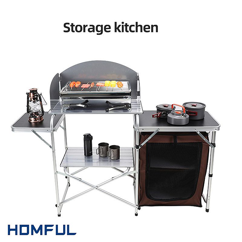 Many people will choose to travel outside, so how do you solve the cooking problem when traveling? If there is a product that can help us save space and facilitate cooking, will it be much better, this is our cooking table has three tabletops and one storage bag? It's not just a cooking table outdoors; it's also a shelf as it has plenty of surfaces to put things on. It has a windshield; it can protect the fire when you use the stove.