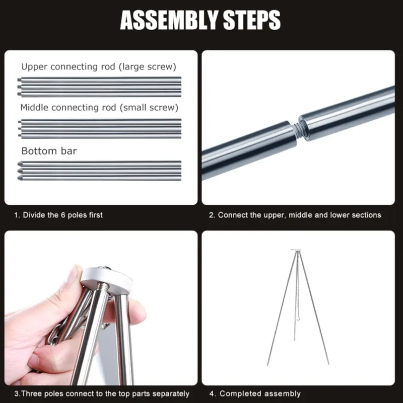 The tripod makes of aluminum alloy, has excellent durability and corrosion resistance, and has adjustable bracket length. The thickened support rod is more durable; The round head design of the lower rod is easier to insert into the ground and more stable for feet. Stainless steel bracket, Splicing design, according to the needs of the number of splicing rods, firm and durable, strong bearing capacity; Adjustable height with chain, the height of the chain can be adjusted, make the hanging pan in a good position. The bracket can be folded for quick installation; Three long supports can be built from short small supports and then installed on the connector; It can be used for lanterns, kettles, and drying clothes. Suitable for camping, picnics, bonfire parties, and barbecue.