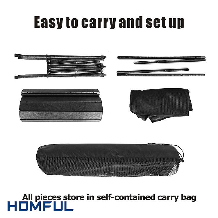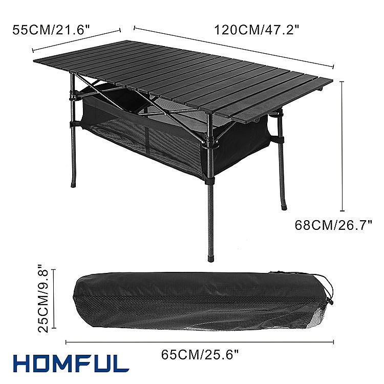 Accesorios: la única bolsa de transporte de una sola pieza y una red receptora. Esta mesa es muy fácil de montar y almacenar. No es necesario repetir ninguna herramienta externa al realizar el montaje. Una persona puede instalarlo con las manos desnudas. Esta mesa de aluminio es muy adecuada para exteriores y patios. La red de almacenamiento debajo de la mesa es desmontable. Cuando acampamos en la naturaleza, a menudo nos preocupamos por demasiadas cosas y por no tener un lugar donde guardarlas. Entonces la red de almacenamiento es un diseño muy práctico. Puedes poner ropa, pequeños complementos, útiles de exterior, etc. Tú decides qué guardar en el trastero. Neto.