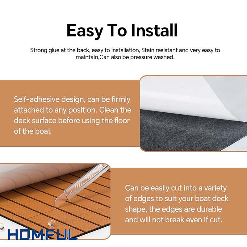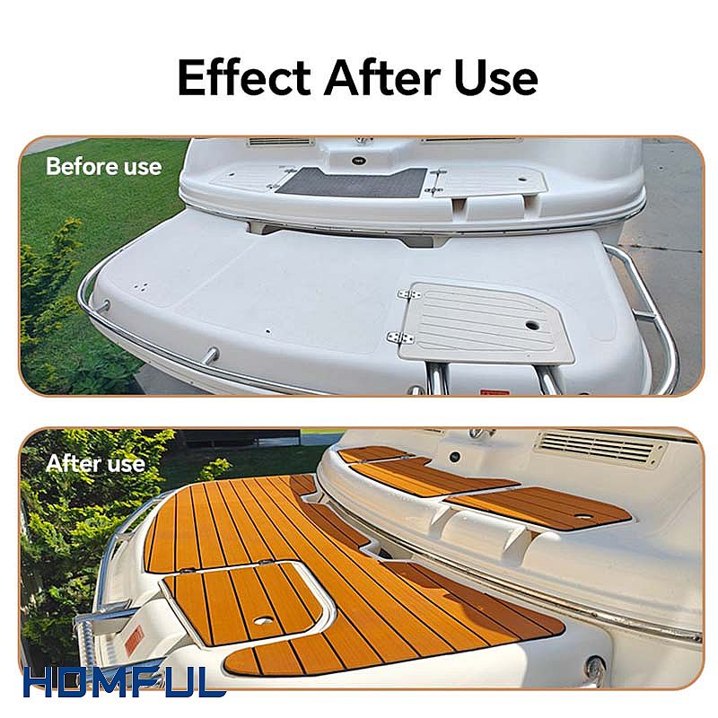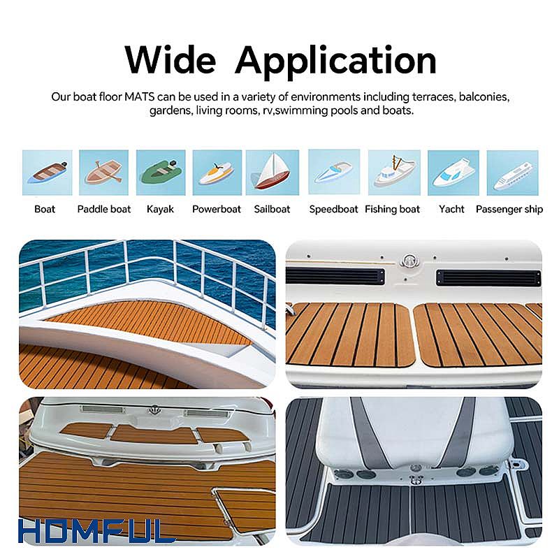 Además, esta alfombra de piso es muy resistente a las manchas, fácil de mantener y limpiar. Esta alfombra también es fácil de instalar y usar. Todo lo que necesita hacer es aplicar una capa de imprimación al fondo de su embarcación antes de instalarla. Esto hará que se adhiera firmemente. Por supuesto, también puede usar directamente nuestro autoadhesivo, para que sea más conveniente de instalar y usar. La forma del cojín se puede adaptar a sus necesidades reales. Esta alfombrilla es perfecta para proteger su tabla de surf o cubierta de tabla de surf mientras proporciona el agarre que necesita. Las alfombrillas de EVA que utilizamos pueden proporcionar un excelente confort y una tracción especial, incluso en suelos mojados. Tienen un grosor combinado de 5-20 mm de material flexible y duradero con un soporte de pelado simple y robusto. Esta alfombra es muy versátil y puede usarla en su yate, decoración de interiores de automóviles. Por supuesto,