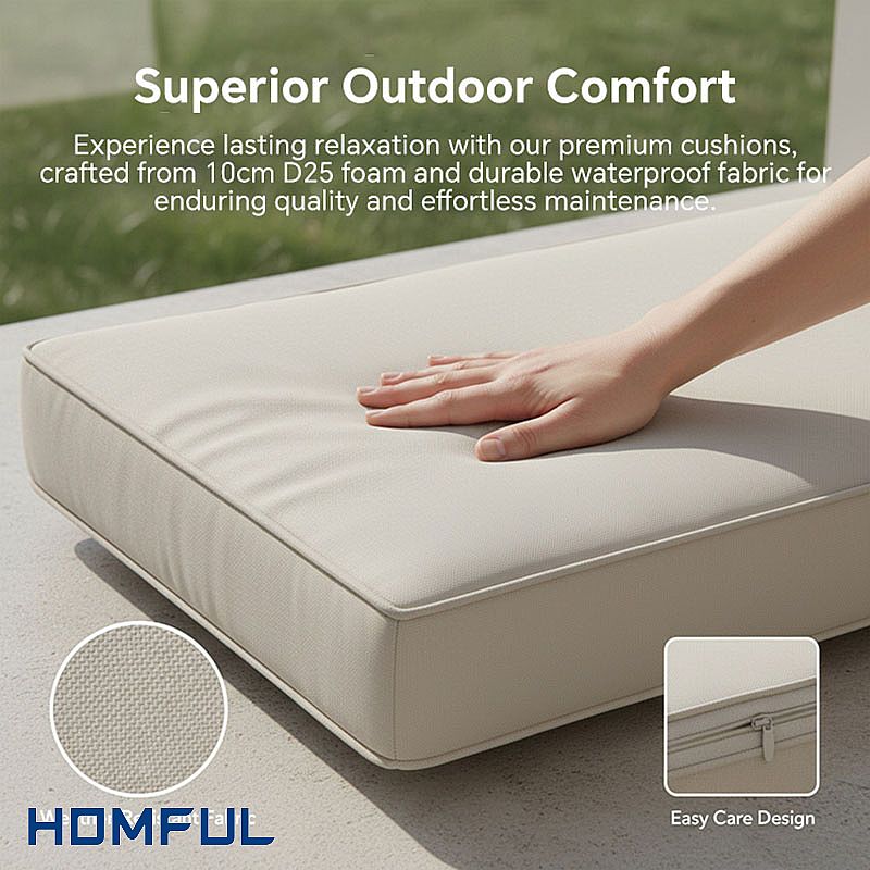 The seating system is engineered for daily use in hospitality and residential settings. Thick 10 cm D25 foam seat cushions maintain their shape and provide balanced support, while the smooth outdoor fabric is water-repellent, easy to wipe clean and removable for maintenance. Seat heights and back angles are carefully tuned to suit relaxed lounging without compromising proper posture, making the set ideal for long conversations, cocktails or casual business meetings outdoors.
