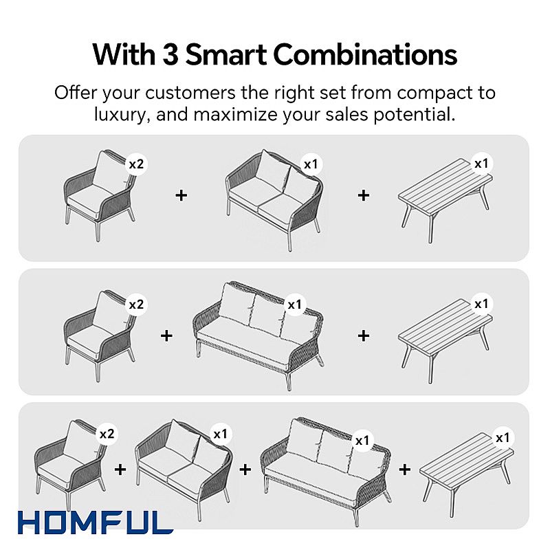 Multiple layout options allow you to adapt the set to different project sizes. Combine two armchairs, a loveseat and the coffee table for compact balconies, or upgrade to include the 3-seater sofa for spacious terraces and villa gardens. Neutral rope and cushion colors coordinate easily with existing umbrellas, rugs and planters, helping distributors and project buyers integrate the set into various design schemes.