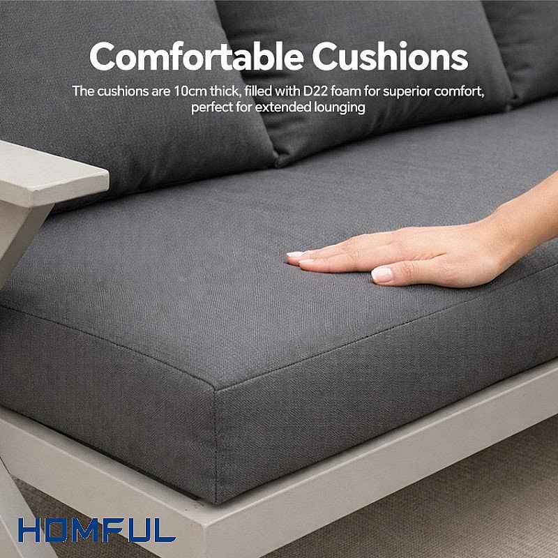 A: Seat cushions are 10 cm thick and filled with D22 foam, delivering supportive comfort without collapsing. The polyester staple fabric cover is durable, comfortable to the touch and designed for outdoor conditions.
