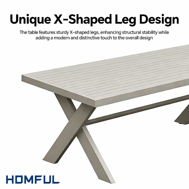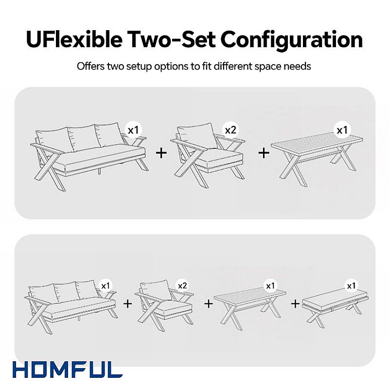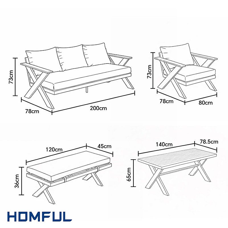 A: The X-shaped table and bench legs provide strong visual identity and extra stability, helping your range stand out, while the modular "sofa + armchairs + bench” layout fits many balcony and patio sizes. The design style is modern but easy to match with existing outdoor collections, making it a safe and profitable item for bulk orders or OEM programs.