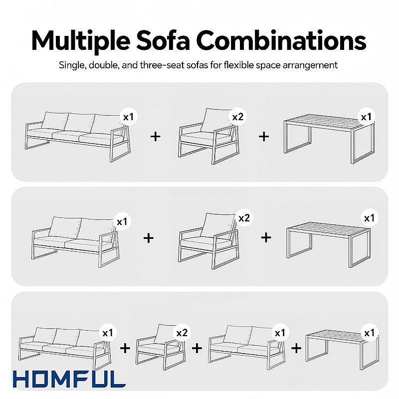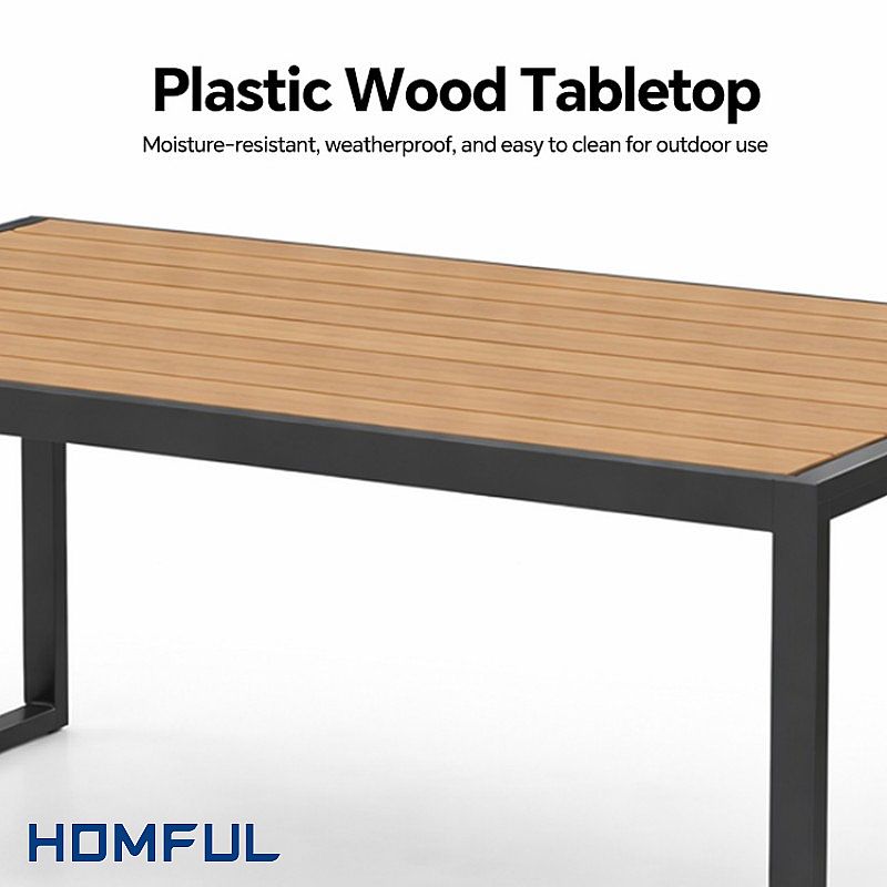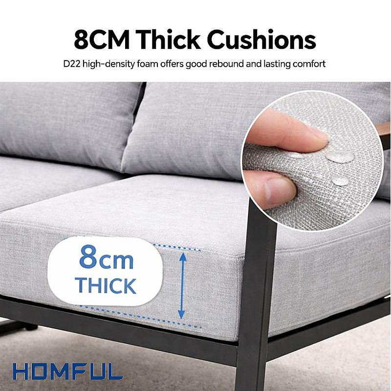 Think of HOMFUL 11C12E as a modular, modern lounge solution you can repeat across multiple outdoor spaces—without redesigning every time. The black metal frame delivers a sharp architectural silhouette, while the wood-grain tabletop and armrest accents add a premium, welcoming tone. Paired with light-grey cushions, it photographs beautifully for showrooms, e-commerce listings, and hospitality projects where "first impression” directly affects bookings and customer dwell time.