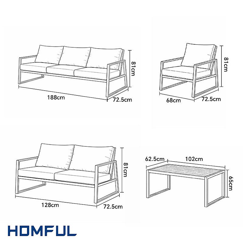 It’s also sized for practical planning: the 3-seater (188cm) anchors the setting, the 2-seater (128cm) balances the layout, and two single chairs let you create conversational zones around the 102×62.5cm coffee table. From boutique hotels and homestays to courtyard seating, poolside lounges, and commercial outdoor waiting areas—this set adapts quickly.
