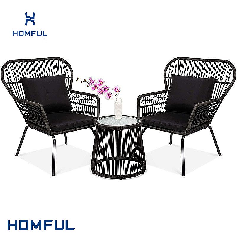 Bistro Set garden chair and table include 1 table and two chairs. The patio furniture material is Wicker, PE rattan, and plastic. Bistro Sets bistro set is a perfect fit for any porch or patio setting. Patio furniture is durable, with weather-resistant seat and back cushions, providing you with a beautiful day. Cushions are constructed with a soft polyester layer wrapped around a thick foam core, making sitting in the chair very agreeable. Wicker Rattan Furniture is popular in the yard.