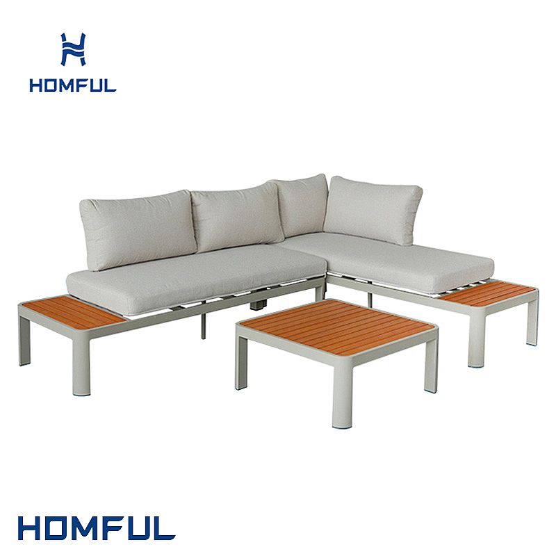 Este conjunto de sofás esquineros para exterior (modelo 11C11G) cuenta con respaldos ajustables y una plaza de dos plazas, lo que lo convierte en un versátil conjunto de sofás metálicos para jardín, ideal para espacios exteriores modernos y proyectos comerciales. Su elegante estructura de aluminio de color claro, sus cálidas incrustaciones de polywood y sus suaves cojines de colores neutros se integran a la perfección en diversos entornos, como villas modernas, hoteles boutique, cafeterías y terrazas residenciales.