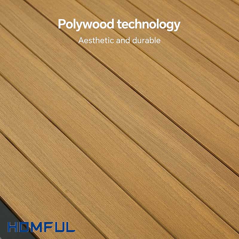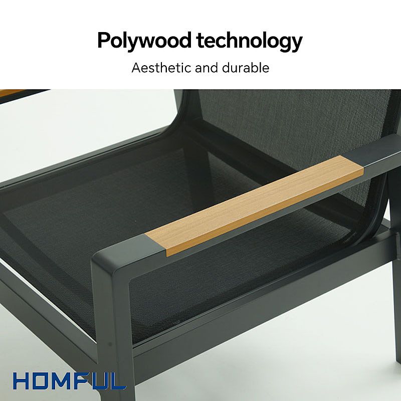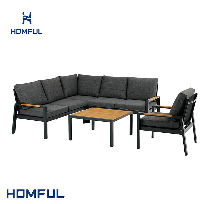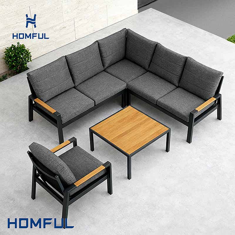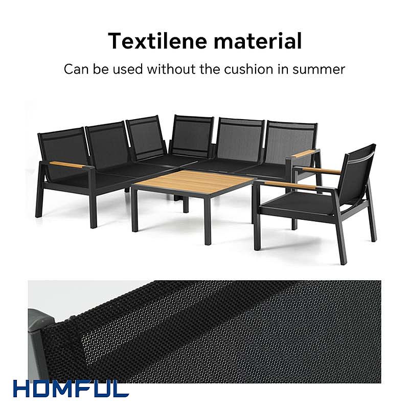 El conjunto incluye dos loveseats (130 x 77 x 79,5 cm), un sofá esquinero (77 x 77 x 79,5 cm), un sillón (74 x 77 x 79,5 cm) y una mesa de centro (80,5 x 80,5 x 41,5 cm). Combinados, crean una espaciosa sala de estar en forma de L con un sillón, con capacidad flexible para 5-6 personas. Importadores y compradores de proyectos pueden adaptar fácilmente la distribución a diferentes espacios, desde balcones compactos hasta amplias terrazas de villas.