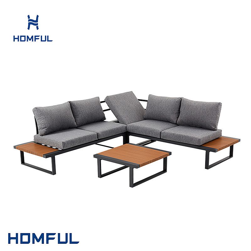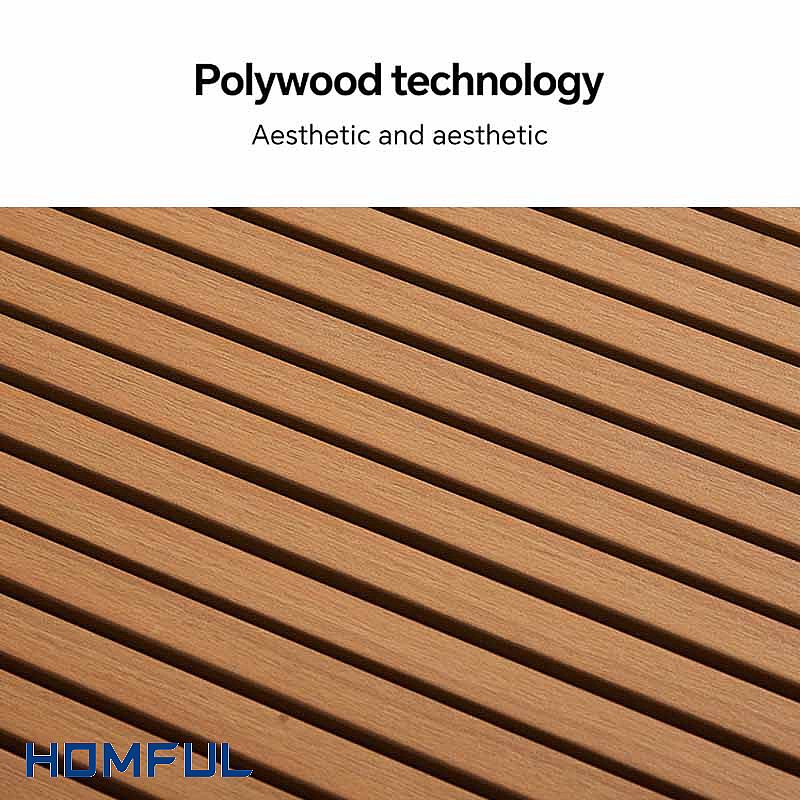 La estructura es de aluminio con recubrimiento en polvo, muy resistente a la oxidación, la corrosión y la decoloración. Los paneles laterales de una sola pieza de polywood y la mesa de centro a juego ofrecen un práctico espacio de almacenamiento para bebidas y artículos decorativos, con la cálida sensación de la madera y sin necesidad de mantenimiento.