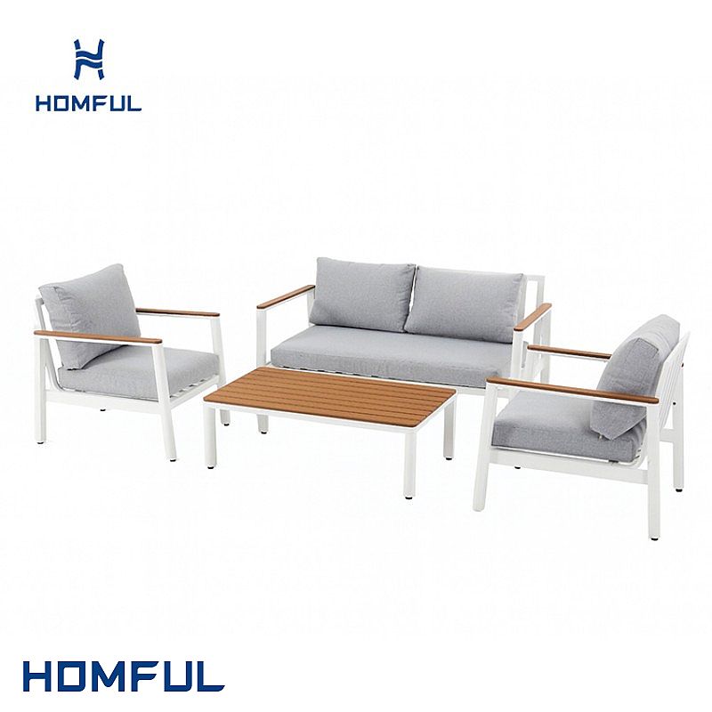 Das Modell 11C11D ist eine moderne Gartenmöbelgarnitur aus Metall, die mit ihrer klaren, minimalistischen Ästhetik jedem Außenbereich eine lebendige Note verleiht. Die Kombination aus einem weiß pulverbeschichteten Aluminiumrahmen, einer Tischplatte in Holzoptik und hellgrauen Kissen macht sie ideal für private Villen, Cafés, Resorts und Balkone.