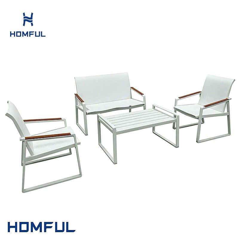 Dieses weiße, vierteilige Gartensofa-Set aus Aluminium ist ein modernes Metallsofa für helle und minimalistische Außenbereiche. Der pulverbeschichtete, weiße Aluminiumrahmen verleiht ihm eine frische und stilvolle, architektonische Ästhetik und passt perfekt zu modernen Villen, Dachterrassen, Cafés und Poolbereichen. Gleichzeitig ist er rost- und farbbeständig bei allen Witterungsbedingungen.