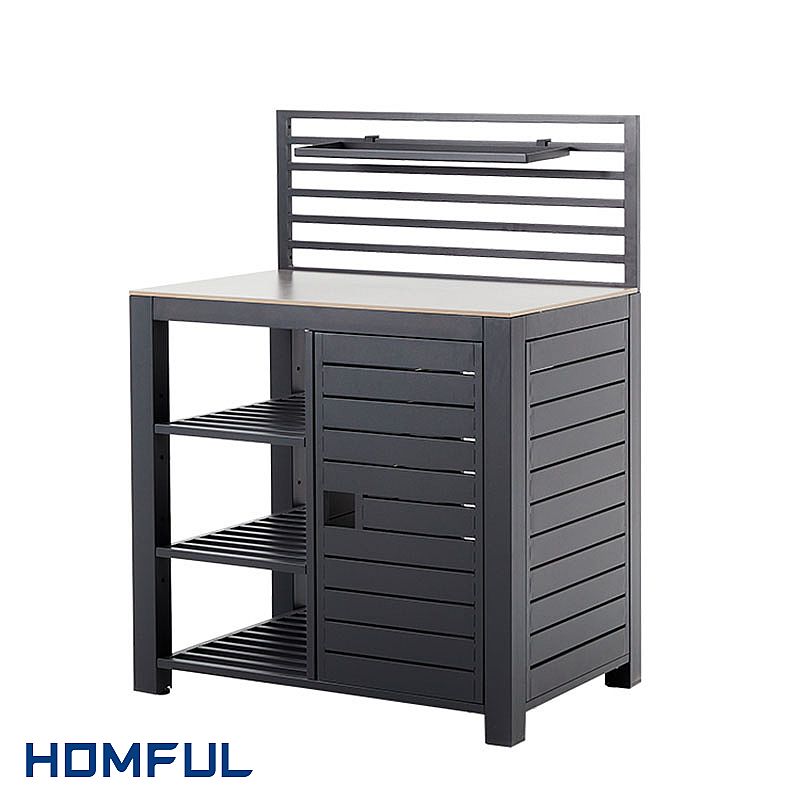 Outdoor kitchen cabinet with storage: The unit features open and closed storage designs with aluminum door panels. The open storage design allows you to easily access things, while the closed storage design can effectively prevent items from dust and dirt. It features a sintered stone finish that combines durability with a warm, contemporary aesthetic.