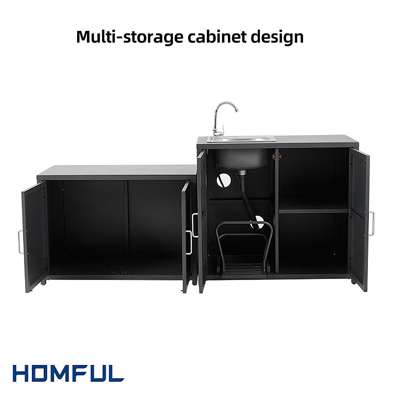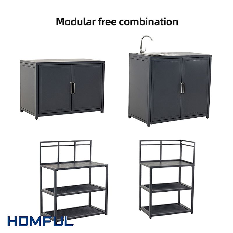 Flexible Lösungen für Außenküchen: Dank des modularen Designs mit separatem Stauraumschrank, Spülenschrank und zwei Regaleinheiten (80/100 cm) können Ihre Kunden jede Terrasse oder jeden Garten individuell gestalten. Vollmetall-Außenküche aus Aluminium für den langfristigen Einsatz im Freien – ideal für europäische und amerikanische Klimazonen und Küstengebiete. Tiefe Schränke, integrierte Spüle und mehrstufige offene Regale bieten großzügigen Stauraum für Kochgeschirr, Grills und Zubehör. OEM/ODM-Unterstützung für Ihre Marke Individuelle Farben, Verpackungen und Branding für Importeure, Großhändler, Einzelhändler und Projektkäufer verfügbar.
