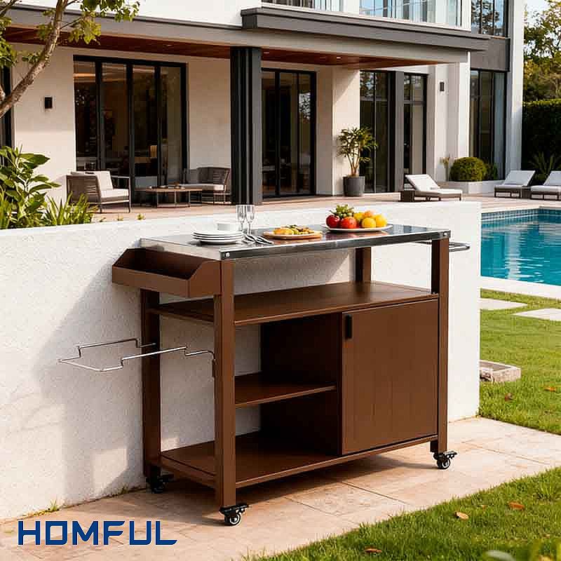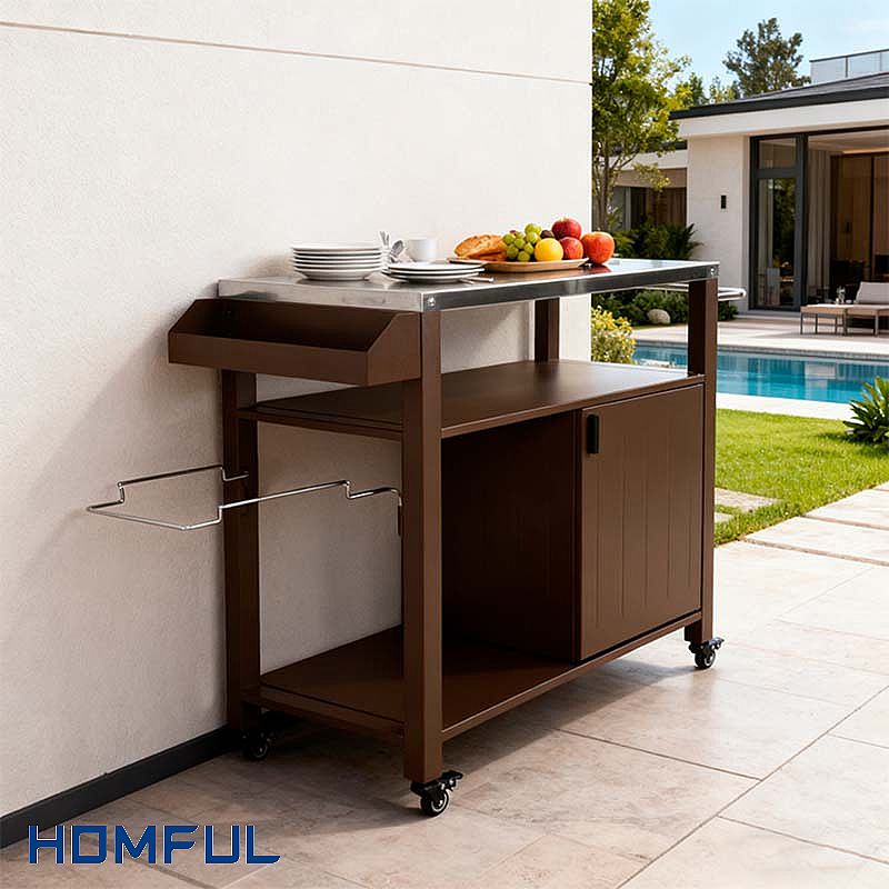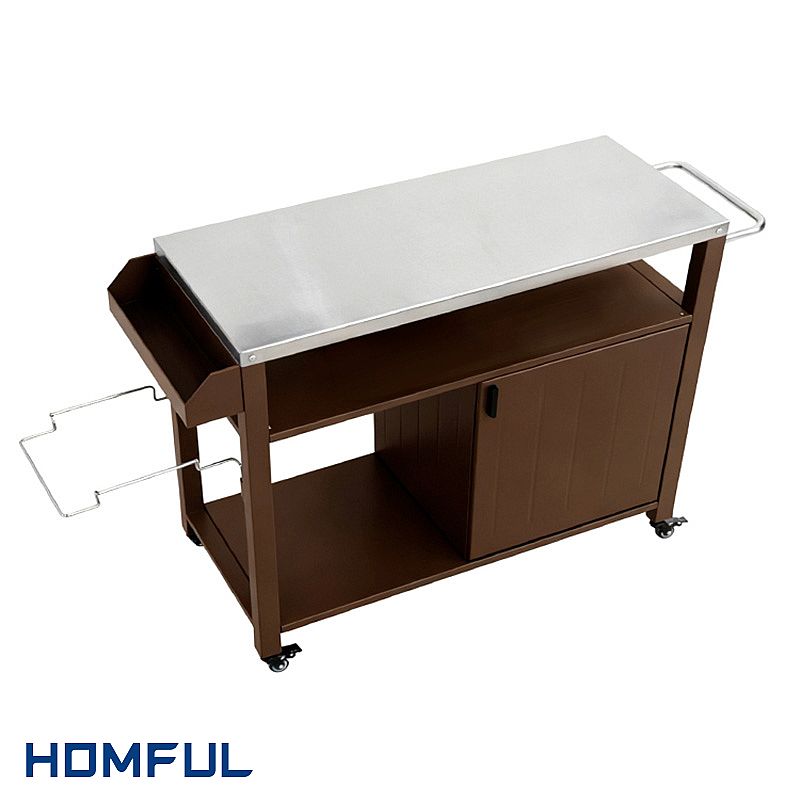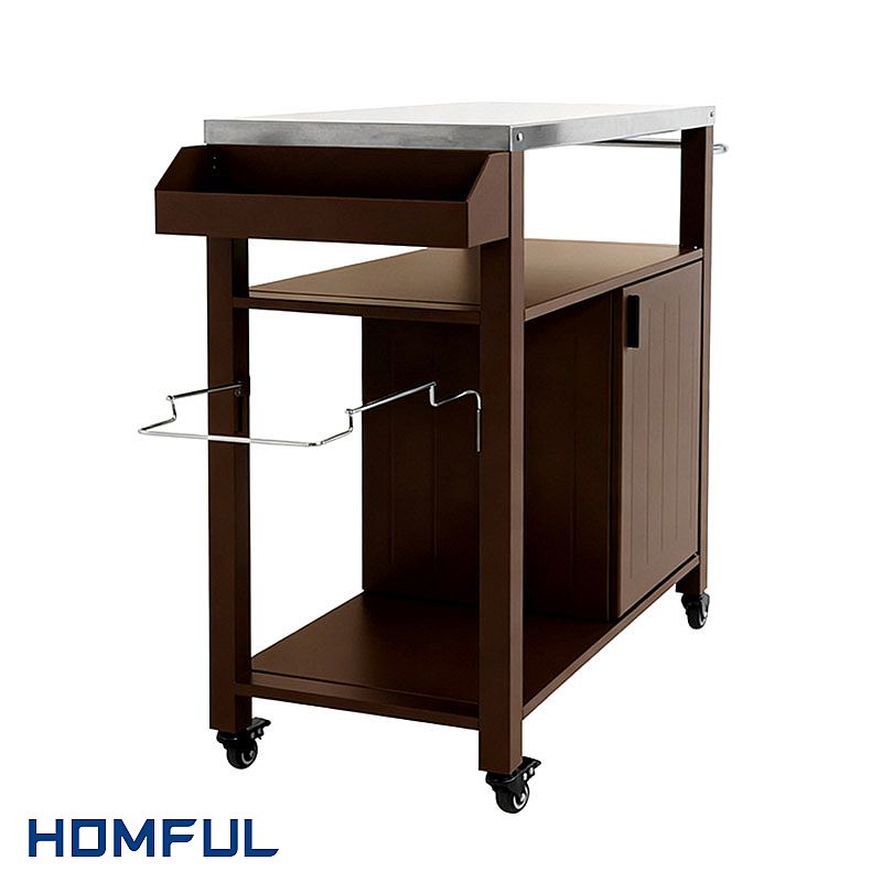 2. Intelligenter Stauraum auf mehreren Ebenen: Ein erhöhtes Tablett an einer Seite der Arbeitsfläche bietet Platz für Besteck, Gewürze oder kleine Teller; ein offenes Fach in der Mitte hält Geschirr oder Körbe; und ein Schrank mit Türen im unteren Bereich bietet Stauraum für Reinigungsmittel oder weniger ansehnliche Gegenstände.