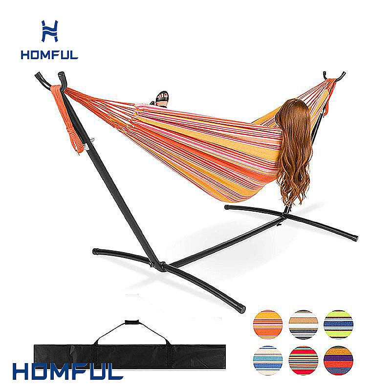 La hamaca está hecha de nailon de alta calidad resistente a la intemperie y algodón colorido que no se estira ni se rasga bajo presión. Este es un gran paquete de hamaca y soporte para descansar al aire libre con estilo o para acentuar la terraza de su patio trasero. La hamaca doble está hecha con algodón 100%, creando un refugio cómodo para una tarde de acurrucarse. Se utilizan tapas de plástico en los extremos de la tubería de acero para crear un acabado suave. Con el estuche de transporte incluido, disfrutará de la libertad de instalar su hamaca en cualquier lugar y ya no dependerá de esos 2 árboles perfectos. ¿Cómo dormir en la hamaca?