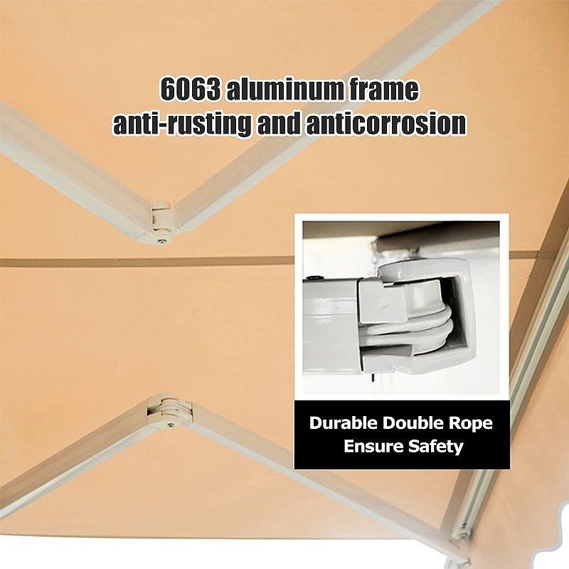 Die einfache Öffnungs- und Schließbedienung kann mit einer Handkurbel erfolgen. Es wird kein Strom benötigt. Drehen Sie schnell und einfach die Handkurbel, um die vordere Neigungsstange anzuheben oder abzusenken, da die Neigung Ihres Vordachs möglicherweise je nach Sonnenstand angepasst werden muss.