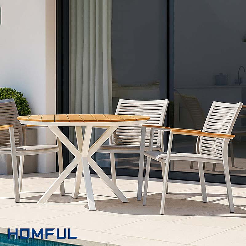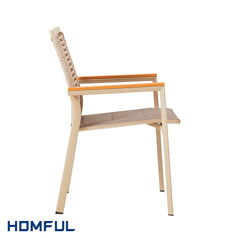 If you’re sourcing outdoor dining chairs for spaces where guests stay longer, texture and comfort matter as much as durability. Model 11D27C combines a clean aluminum frame with a hand-woven polyester rope backrest, delivering a modern resort aesthetic that works across many outdoor design styles—stone, wood, concrete, or aluminum tabletops.