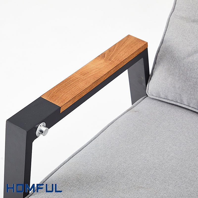 The seat and back cushions use polyester fabric with foam filling, balancing support and softness for long sitting sessions. At 59×58×106 cm, the chair reads substantial and premium in a project, yet it’s still easy to pair with modern outdoor dining tables in aluminum, stone, or wood finishes. Wood-look armrest accents add warmth and a boutique-hotel touch that helps elevate the overall set.