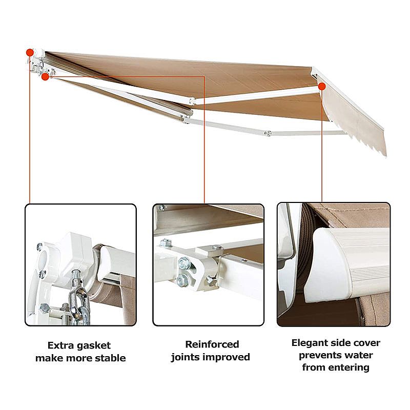 La operación simple de apertura y cierre se puede realizar con una manivela. No se necesita electricidad. Rápida y simplemente gire la manivela para subir o bajar la barra de inclinación frontal porque es posible que deba ajustar la pendiente de su toldo según el ángulo del sol.