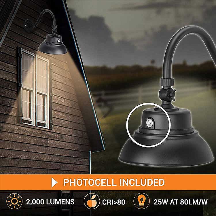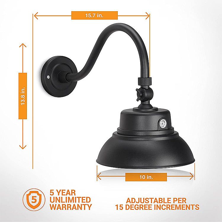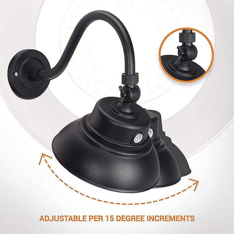 The wall light is equipped with a pre-installed twilight for the dawn light to turn on and off automatically! The black gooseneck barn light can easily disconnect it! The wall light is Super Bright-Bring the best lighting for your application, with an efficiency of over 95Lm/W. The wall light is only 25 watts, 200 lumens of beautiful warm white light! The wall light has an amazing life span of over 50,000, used 6 hours daily! The wall light is easily adjustable. The wall light is Beautiful, like a beautiful swan neck.
