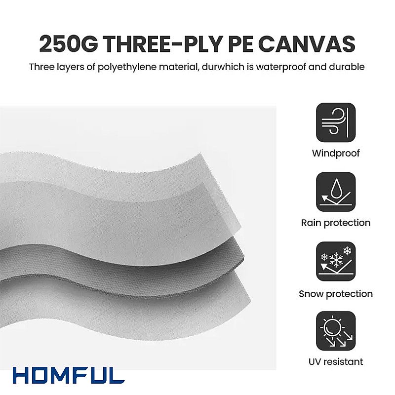 Dreischichtige 250-g-PE-Abdeckung: Die robuste graue Abdeckung besteht aus dreischichtigem 250-g-PE-Material, das unter anderem reißfest, wasserdicht, UV-beständig, winddicht, regendicht, staubdicht und schneesicher ist.