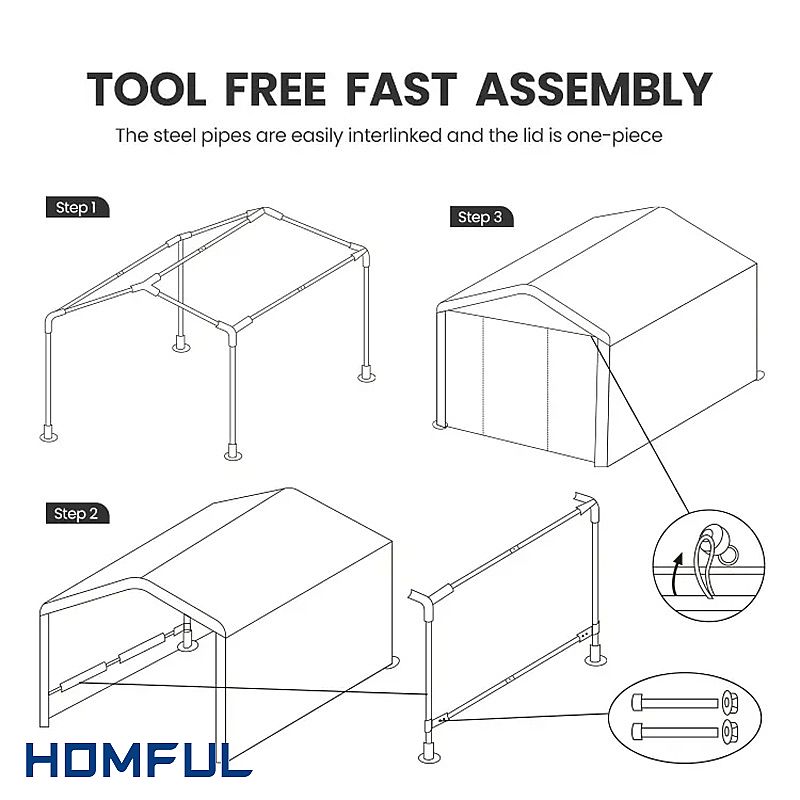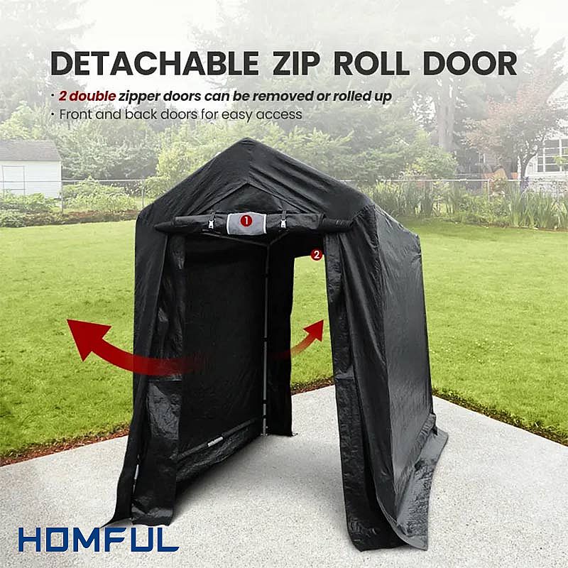 Vielseitig einsetzbar: Der tragbare Unterstand kann als kompakter Garagenunterstand für Fahrzeuge, als Lagerschuppen für Geländefahrzeuge, als Zelt zum Abstellen von Fahrrädern oder als Unterstand für Motorräder verwendet werden. Für kleine Rasenmäher, Brennholz oder andere Gartengeräte ist es ebenfalls geeignet.