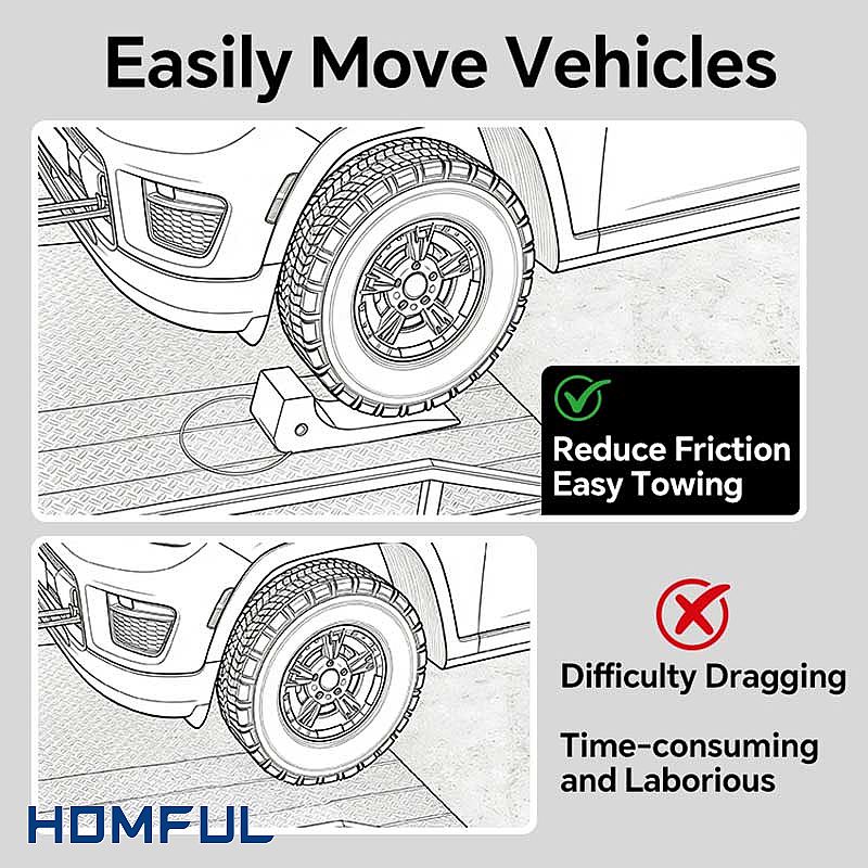 A: It reduces friction under the tire, making it easier to move a vehicle that’s difficult to drag—saving time and effort during towing, loading, and workshop repositioning.